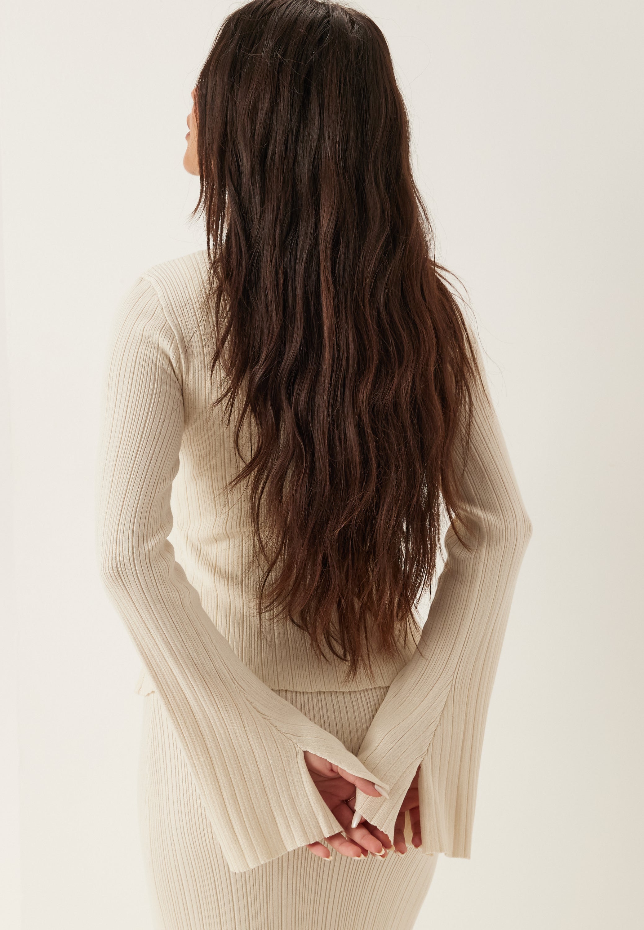 The soft ribbed knit adds stretch and texture without feeling bulky, so it sits smoothly and feels comfortable through the day. In the image, the light cream tone gives it a fresh, polished look that pairs especially well with tonal knits, tailored trousers or denim.