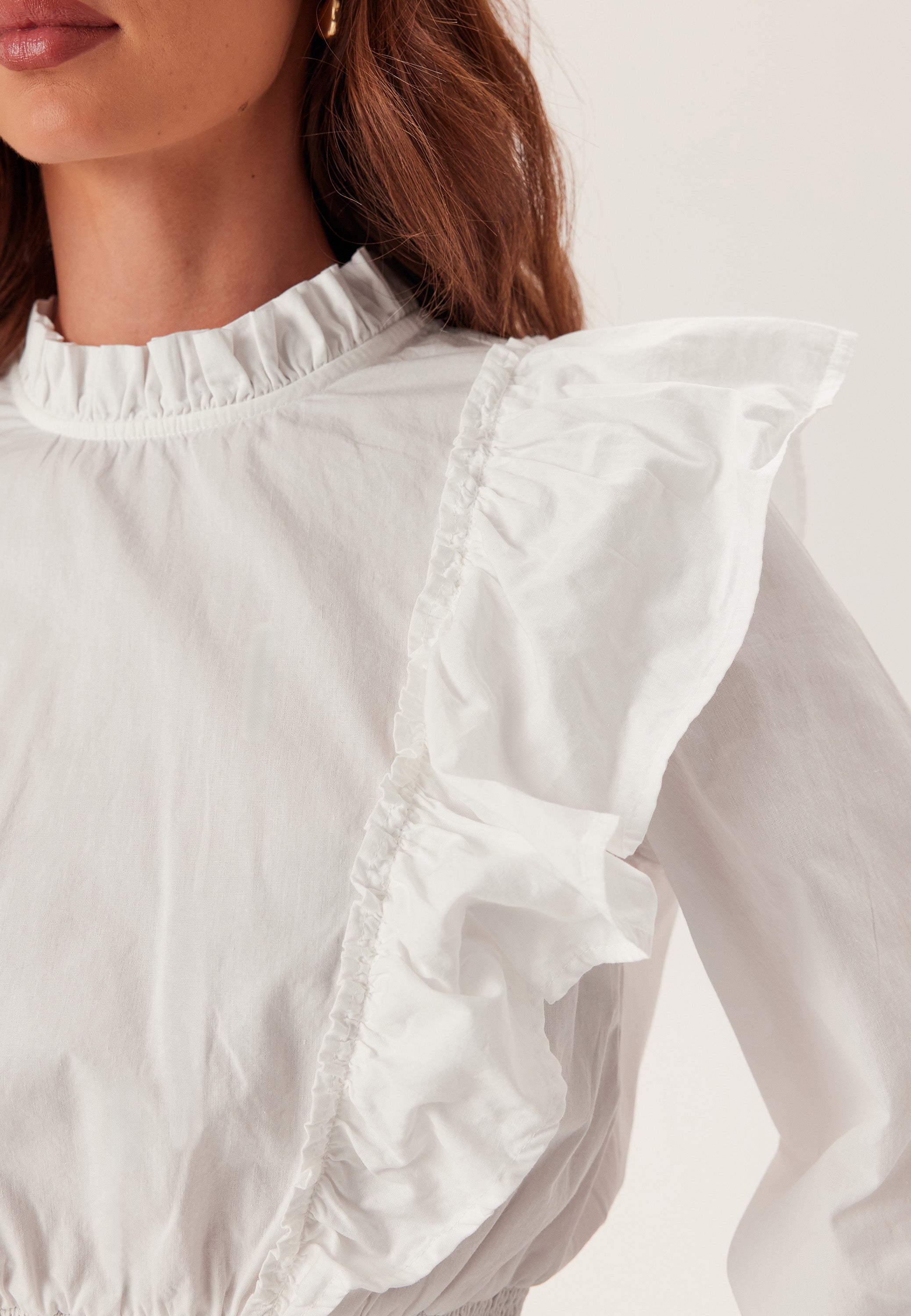 - Rounded neckline with a frill