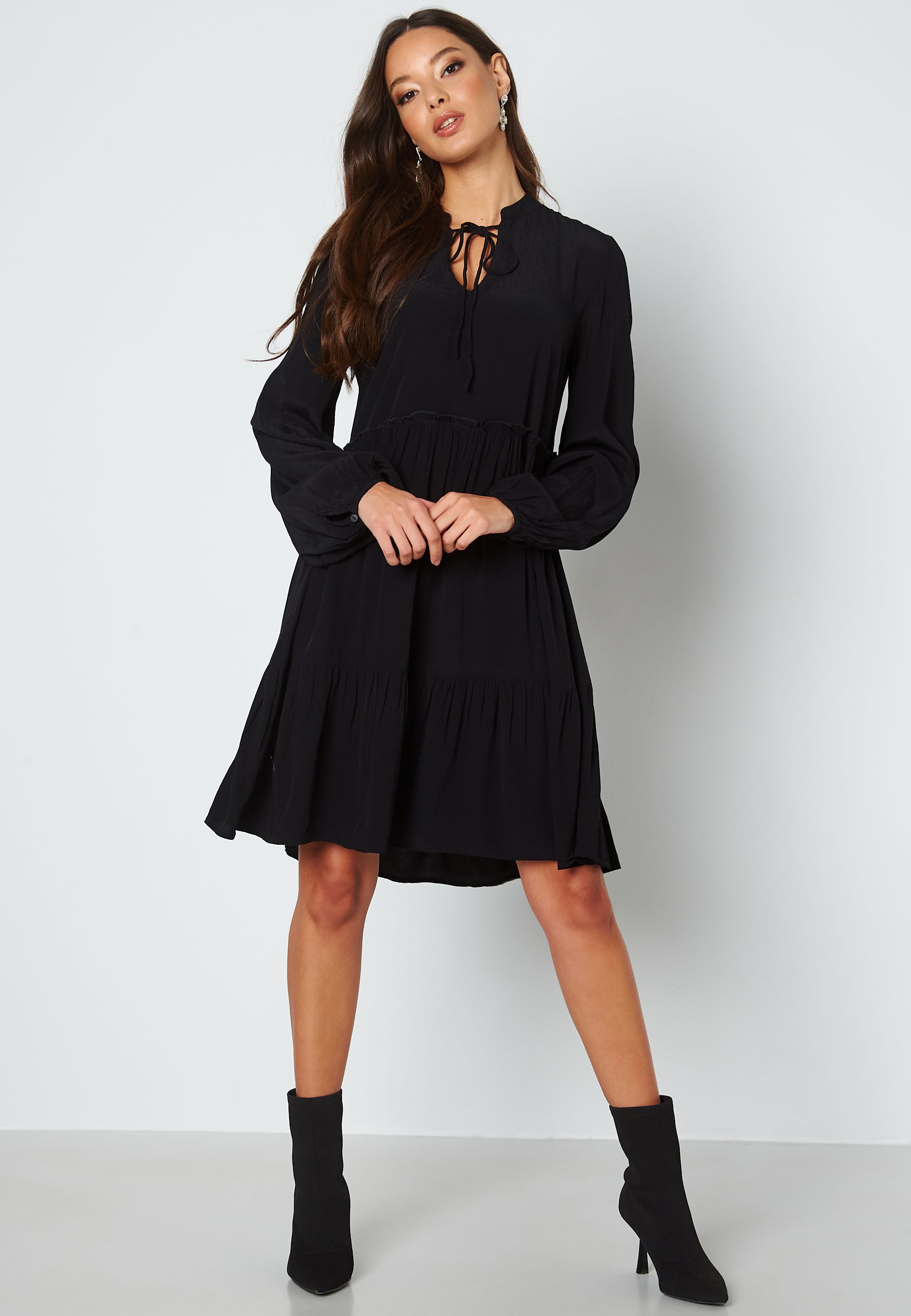 - Deep neckline with self-tie