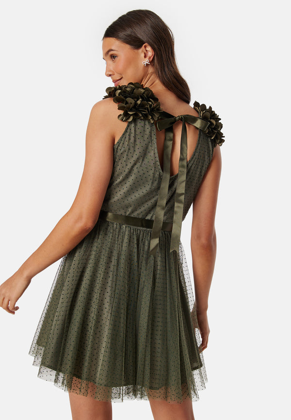 - Decorative tulle layer with small dots.
