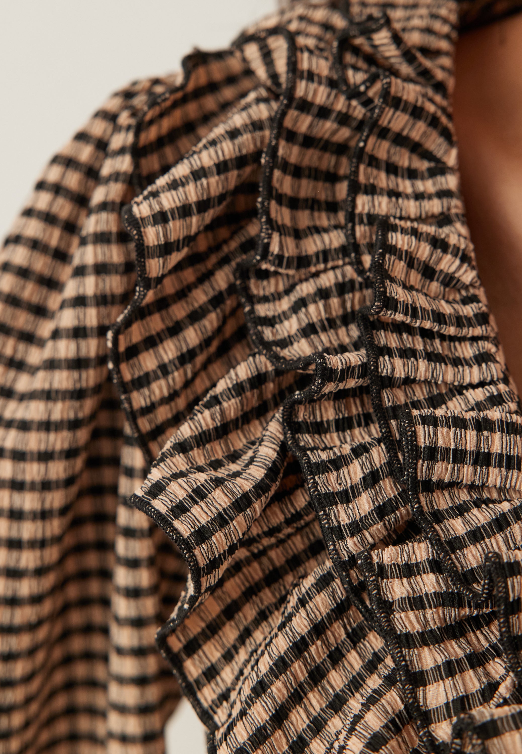 - V-shaped neckline with frills