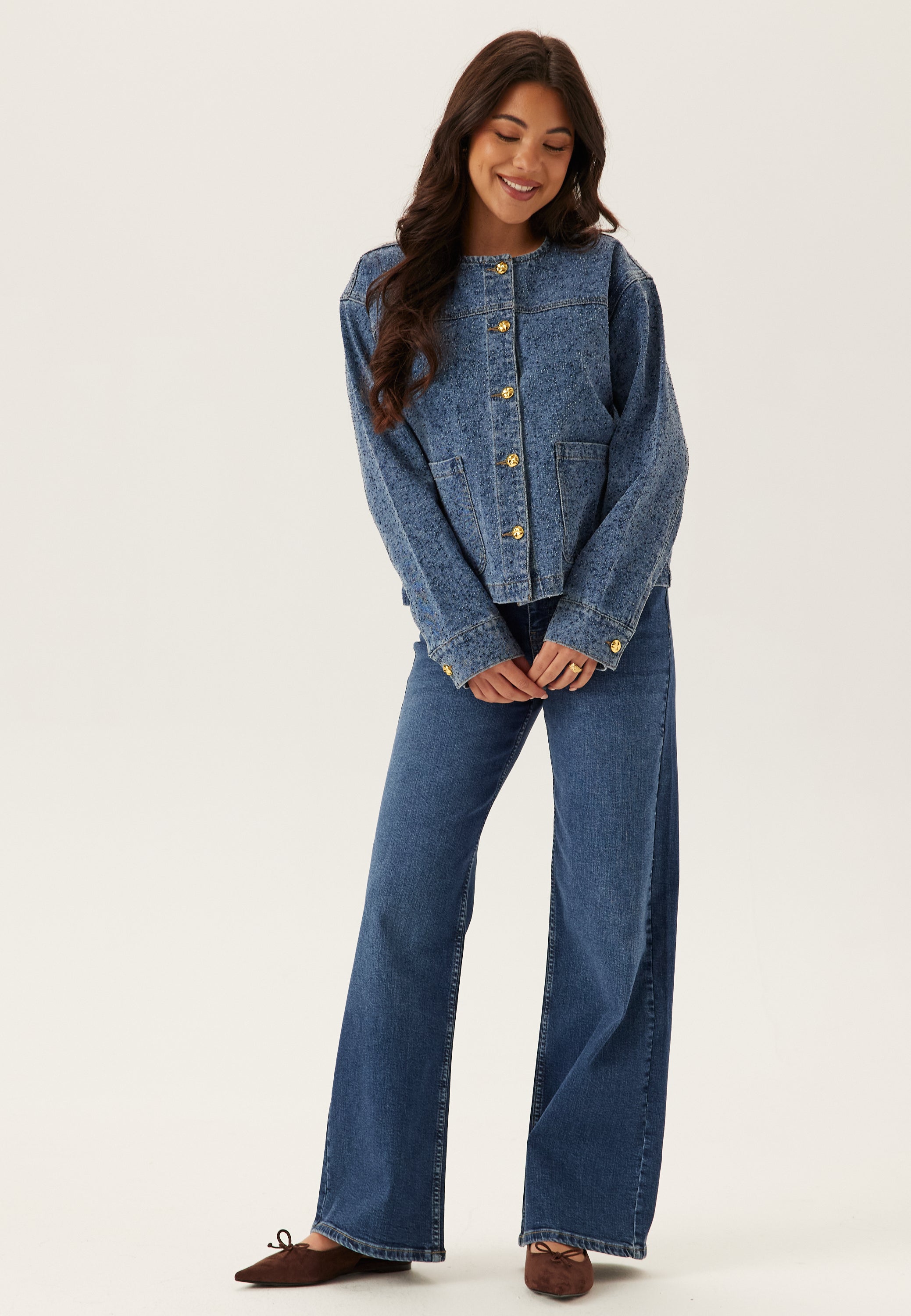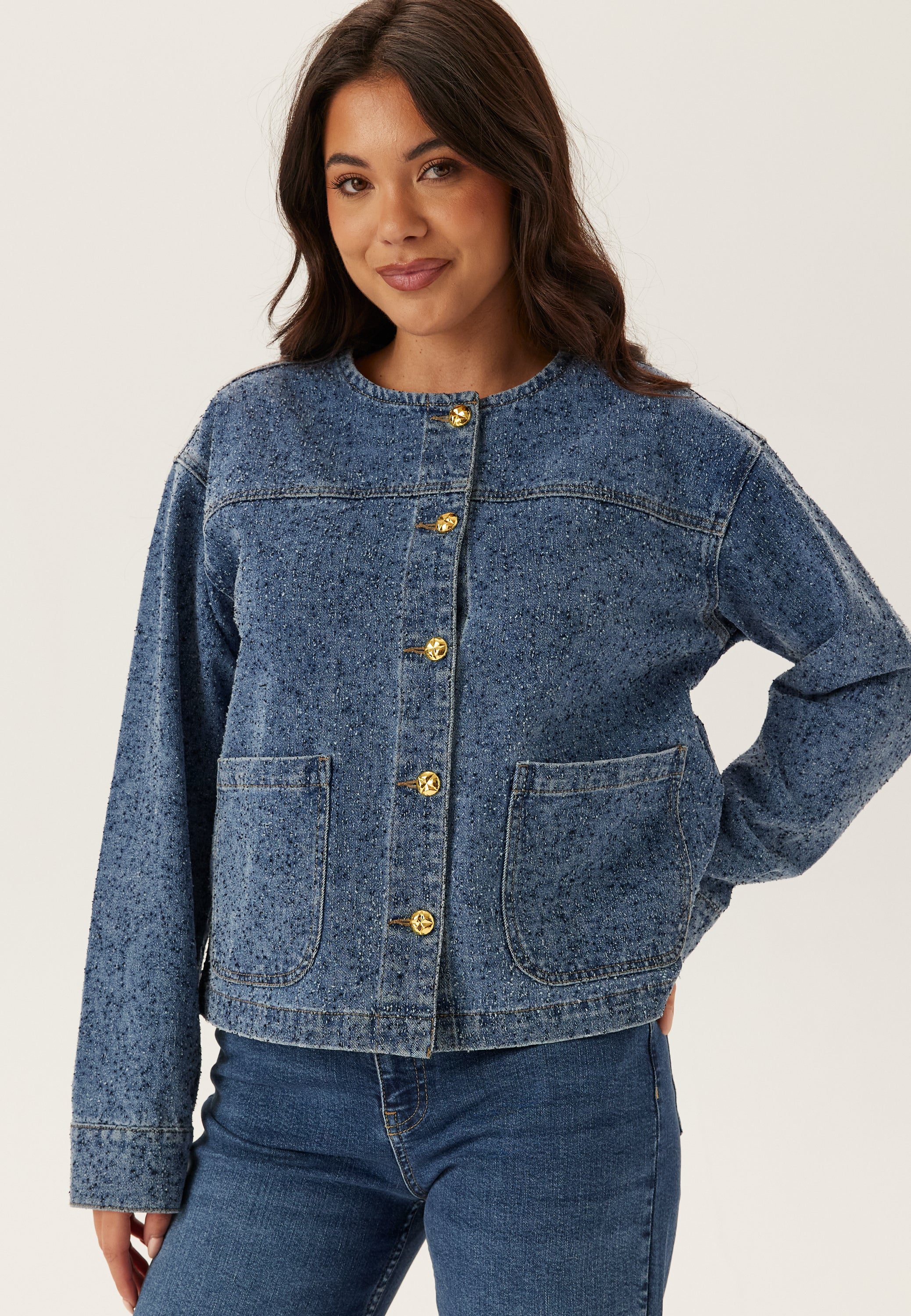 - Button closure at the front