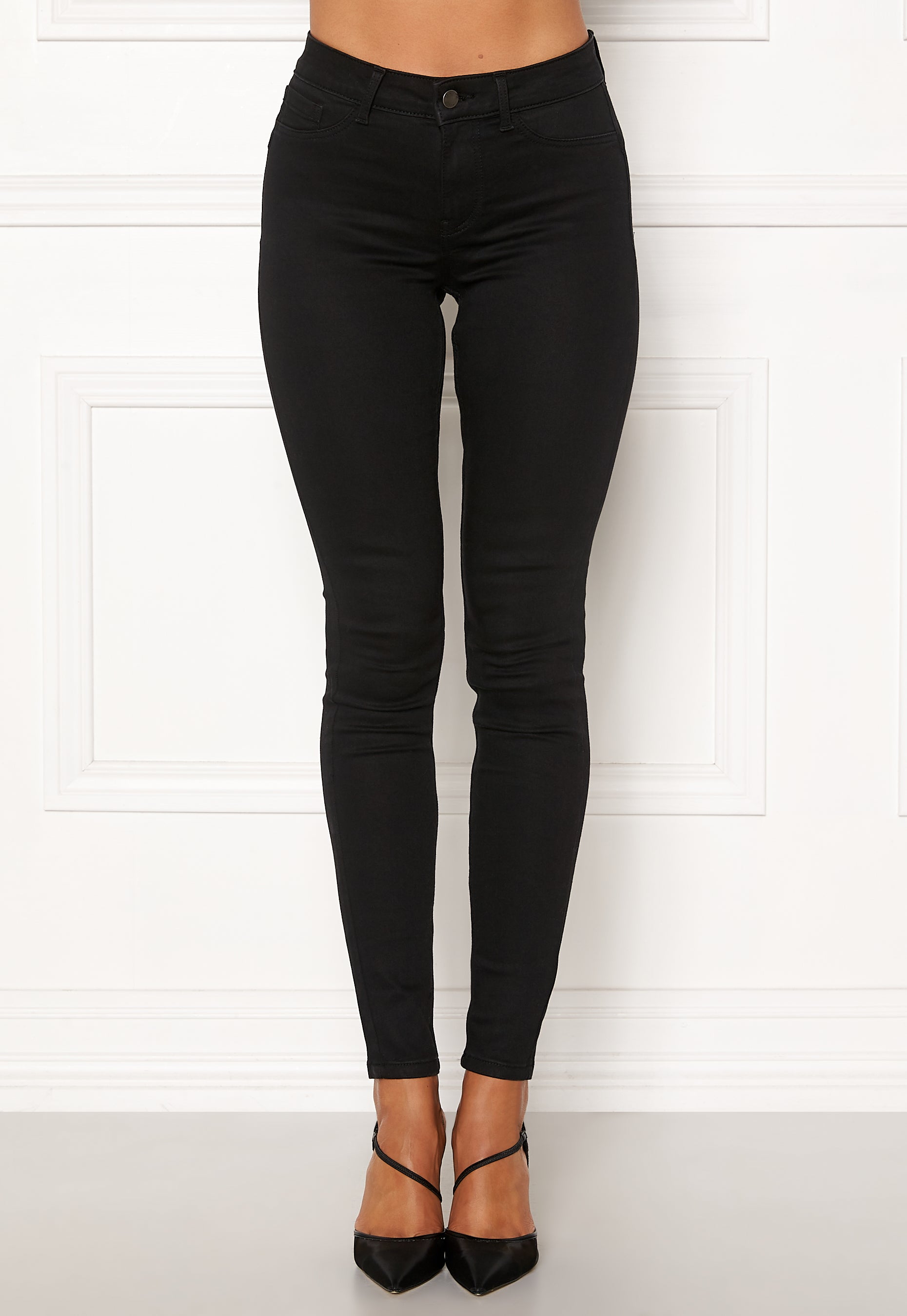 Lovely jeans from PIECES. The jeans have a comfortable fit and a stretchy quality. - Woven, stretchy quality - Closure with zip fly and button - Fake front pockets - Two back pockets - Medium front rise Inside leg 76 cm, Front rise 22.5 cm in size S. The model is 176 cm tall and wears a size S. Machine wash at 40 degrees.