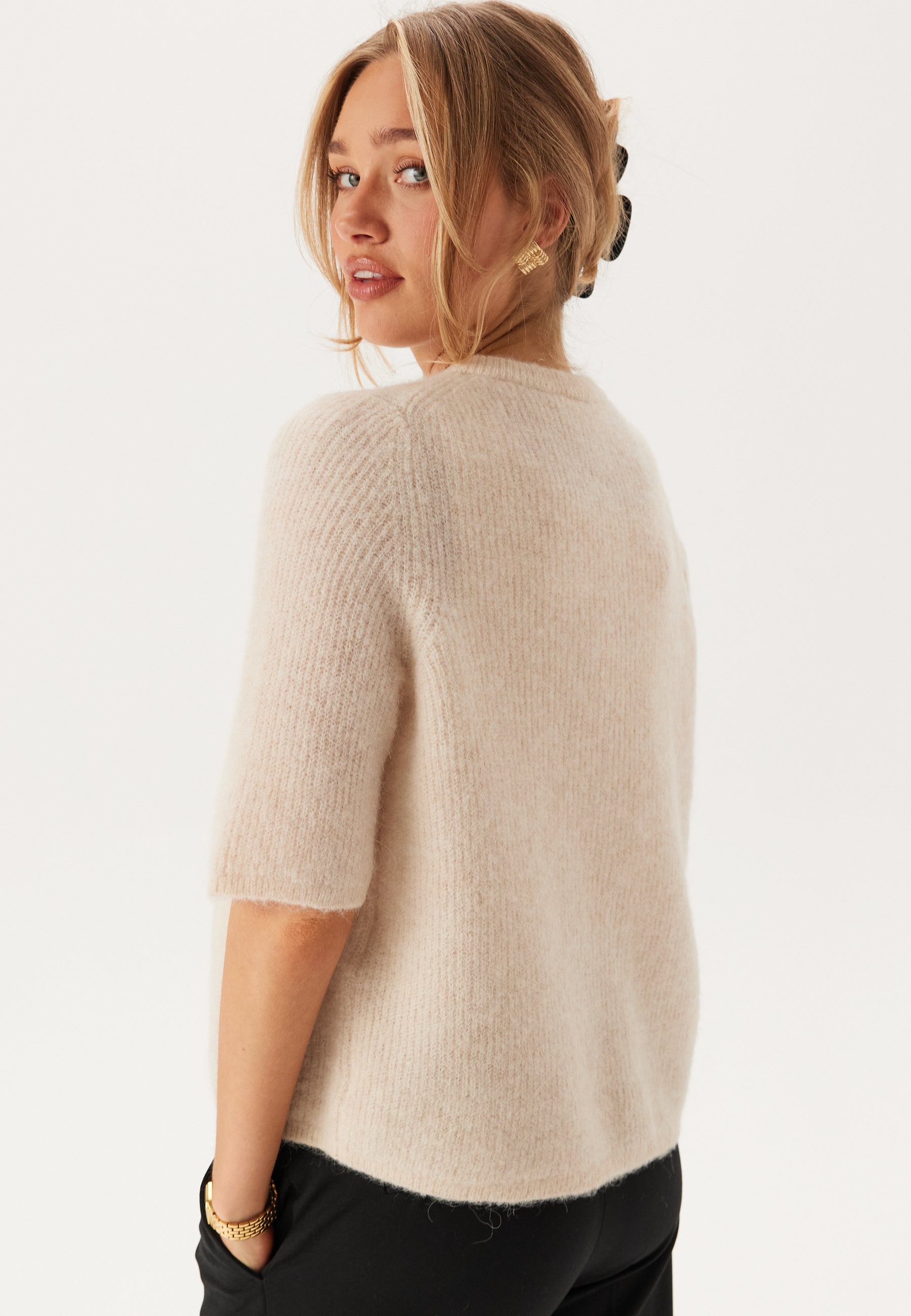 - Slouchy, rib-knit quality.