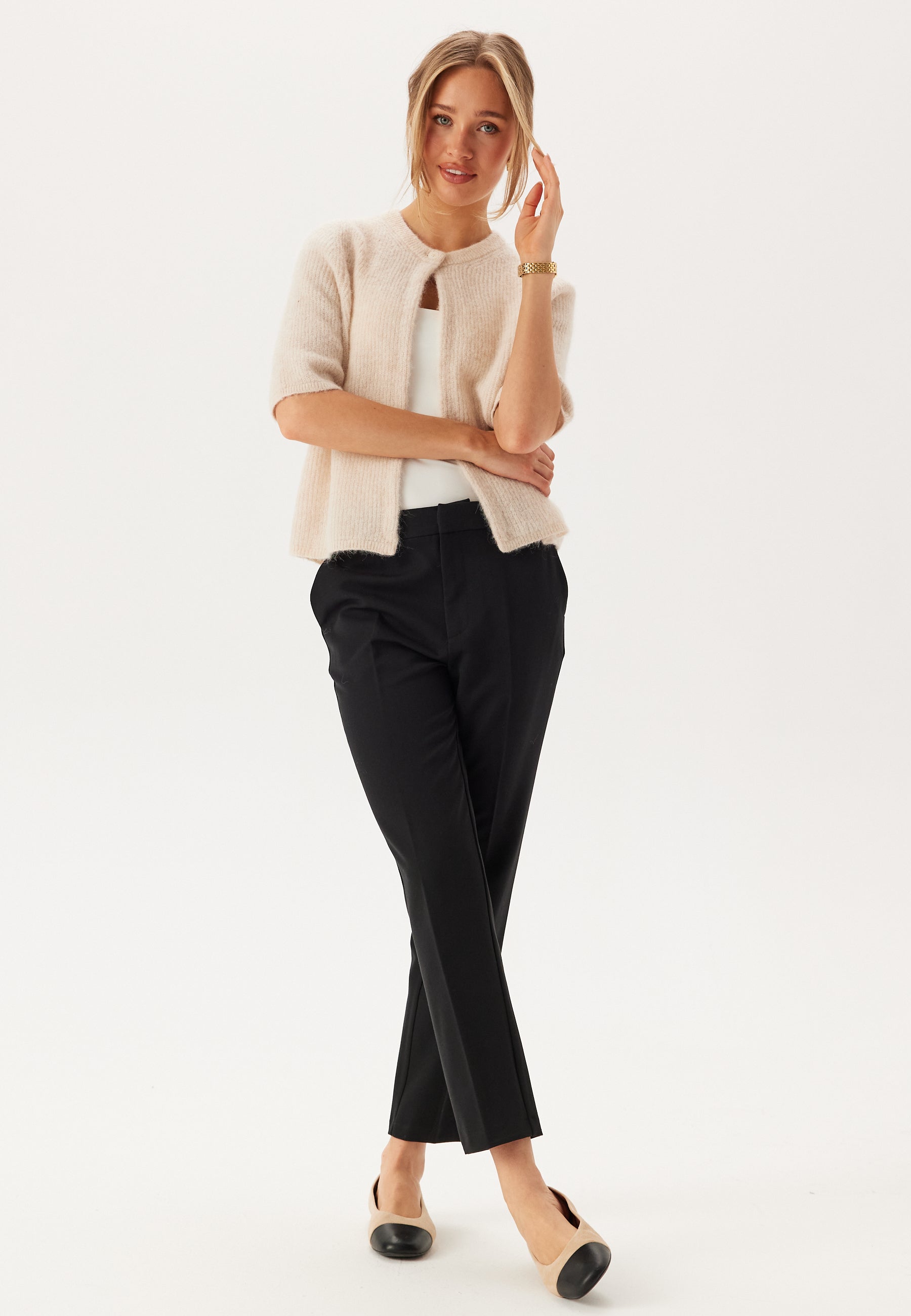 Knit cardigan with short sleeve.