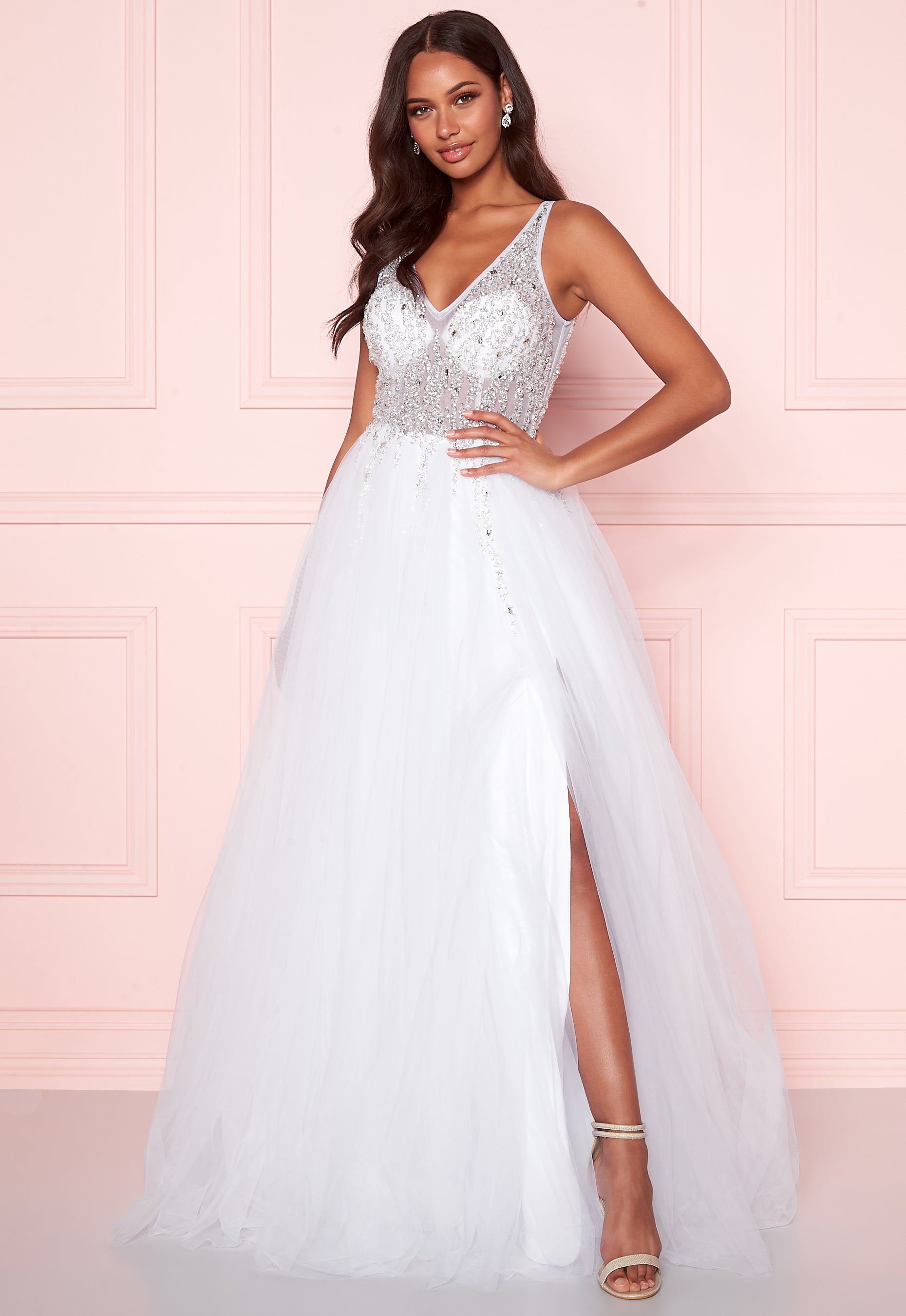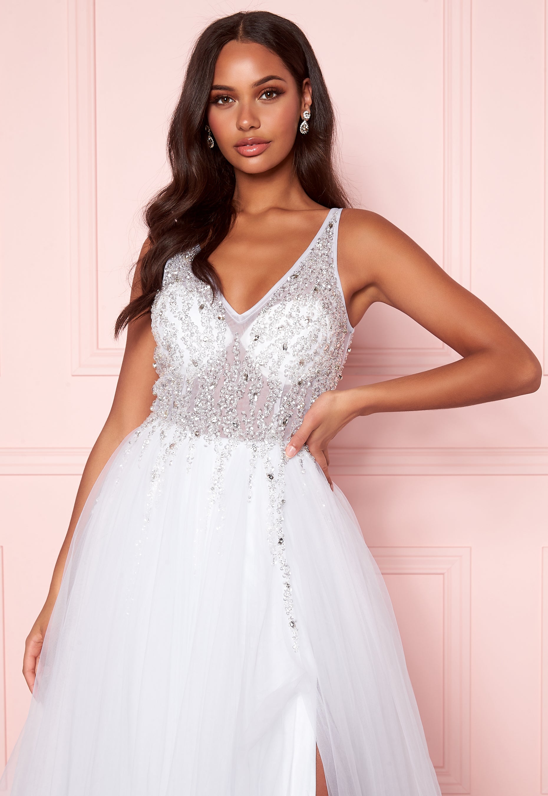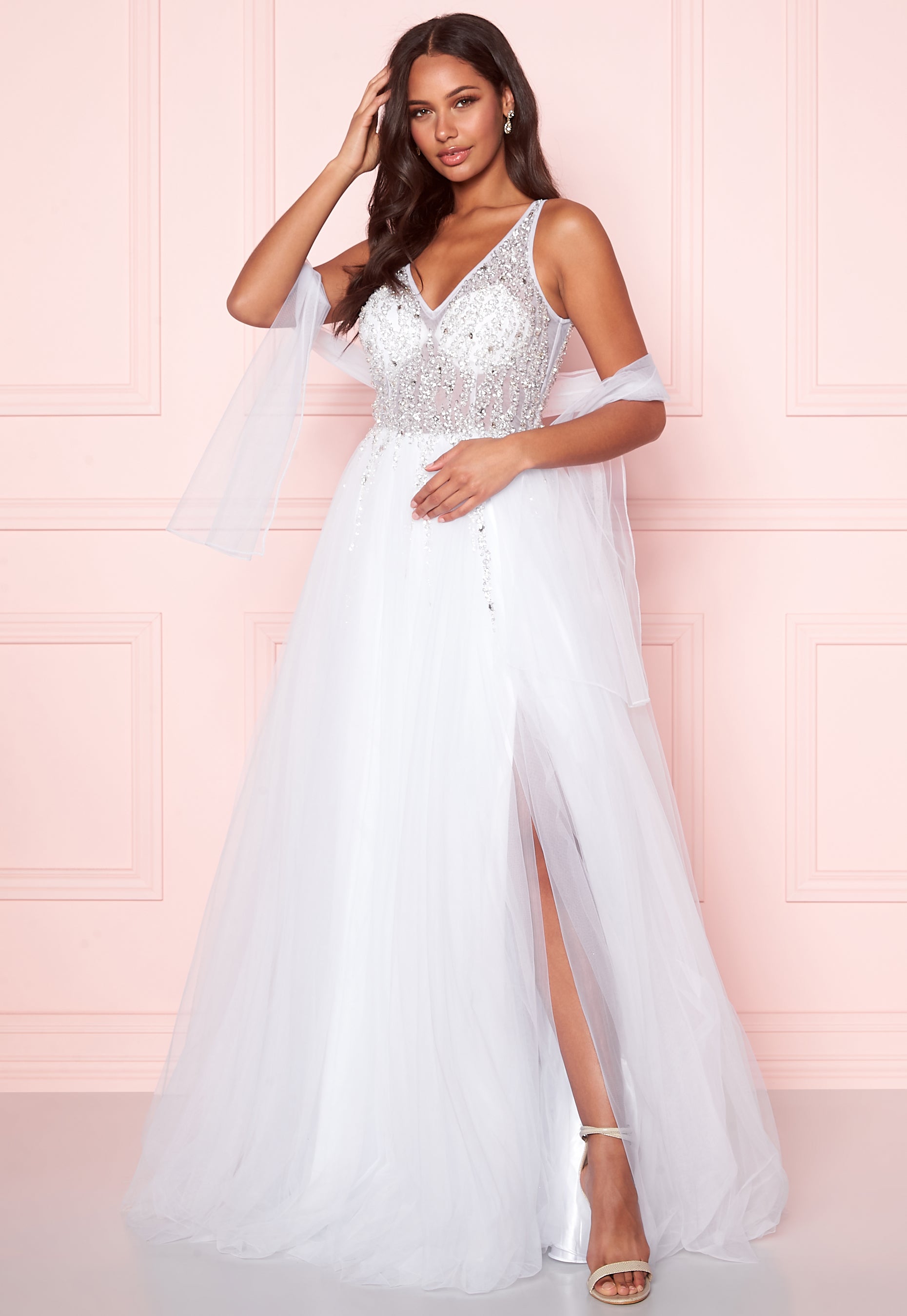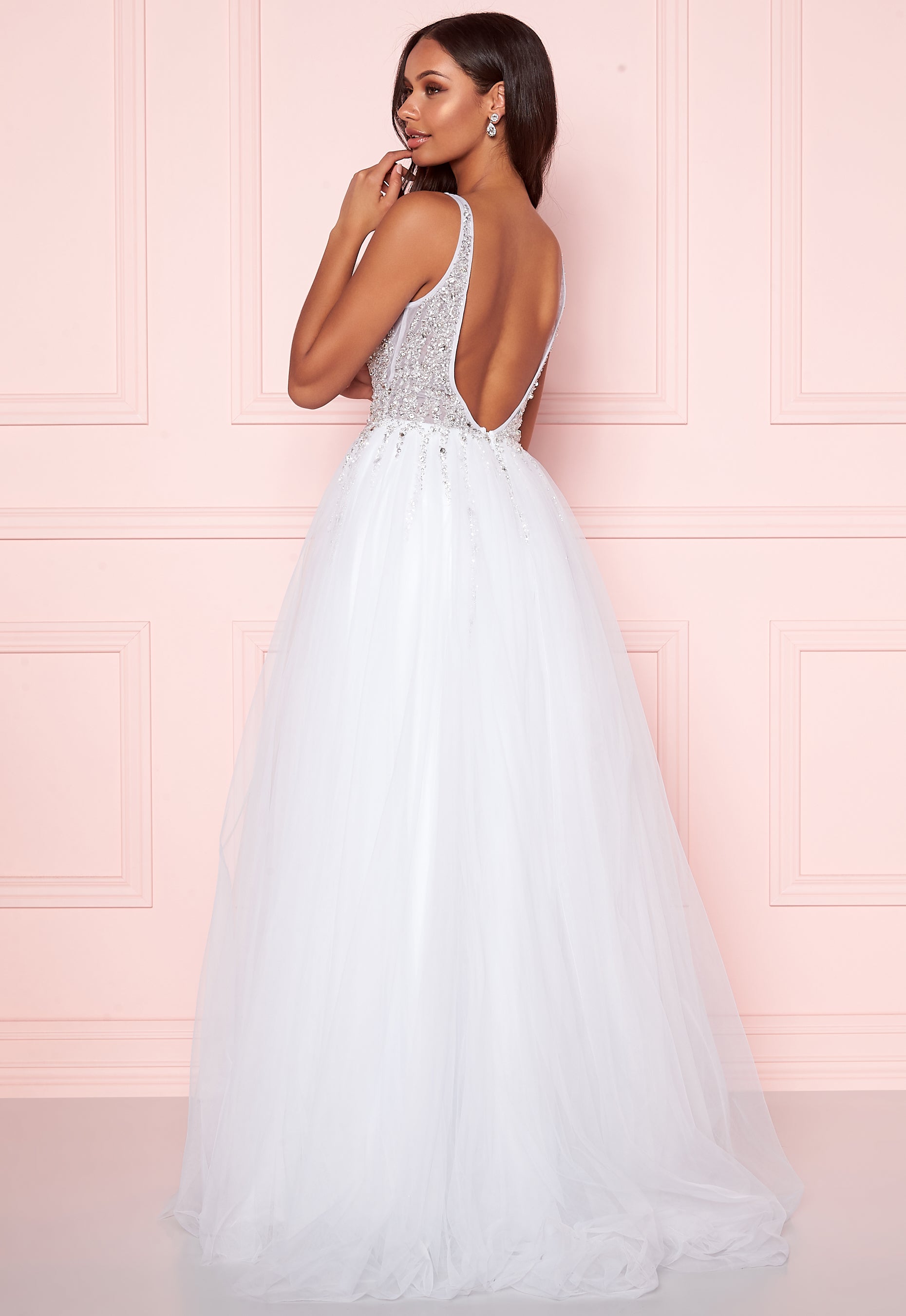 Beautiful, long tulle dress from CHRISTIAN KOEHLERT. The dress has a decorated upper and lovely fall, perfect for festive occasions. - Adorned with pearls, sequins and stones on the top part - V-neck at the front and deep plunging backline - Concealed back zipper - Semi-sheer fabric on upper - Shawl included - Travel bag and hanger included - Padded cups - Three layers of tulle on skirt - Lined Back length from shoulder 177 cm, bust 80 cm, waist 66 cm in size 36. The model is 173 cm tall and wears a size 36. Dry clean only. For returns to be accepted, the dress must be returned with the original travel bag, tags and without smudges. Please note: the dress is slightly larger than usual. If you are between two sizes, please select the smaller size. The dress has a longer lenth, in order for it to be adjustable and fit all lengths.