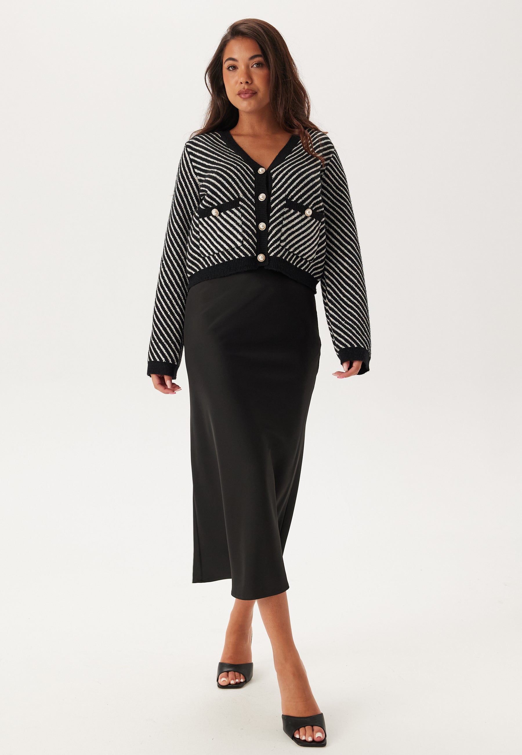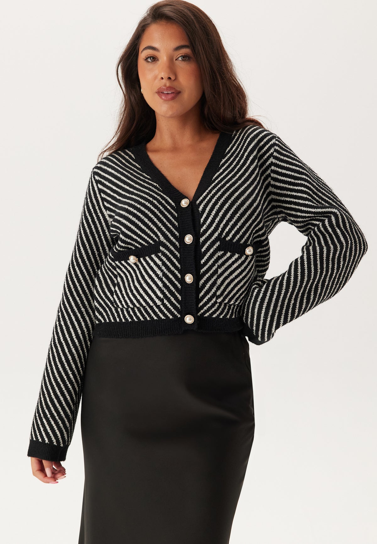 - Pearl button closure at the front.
