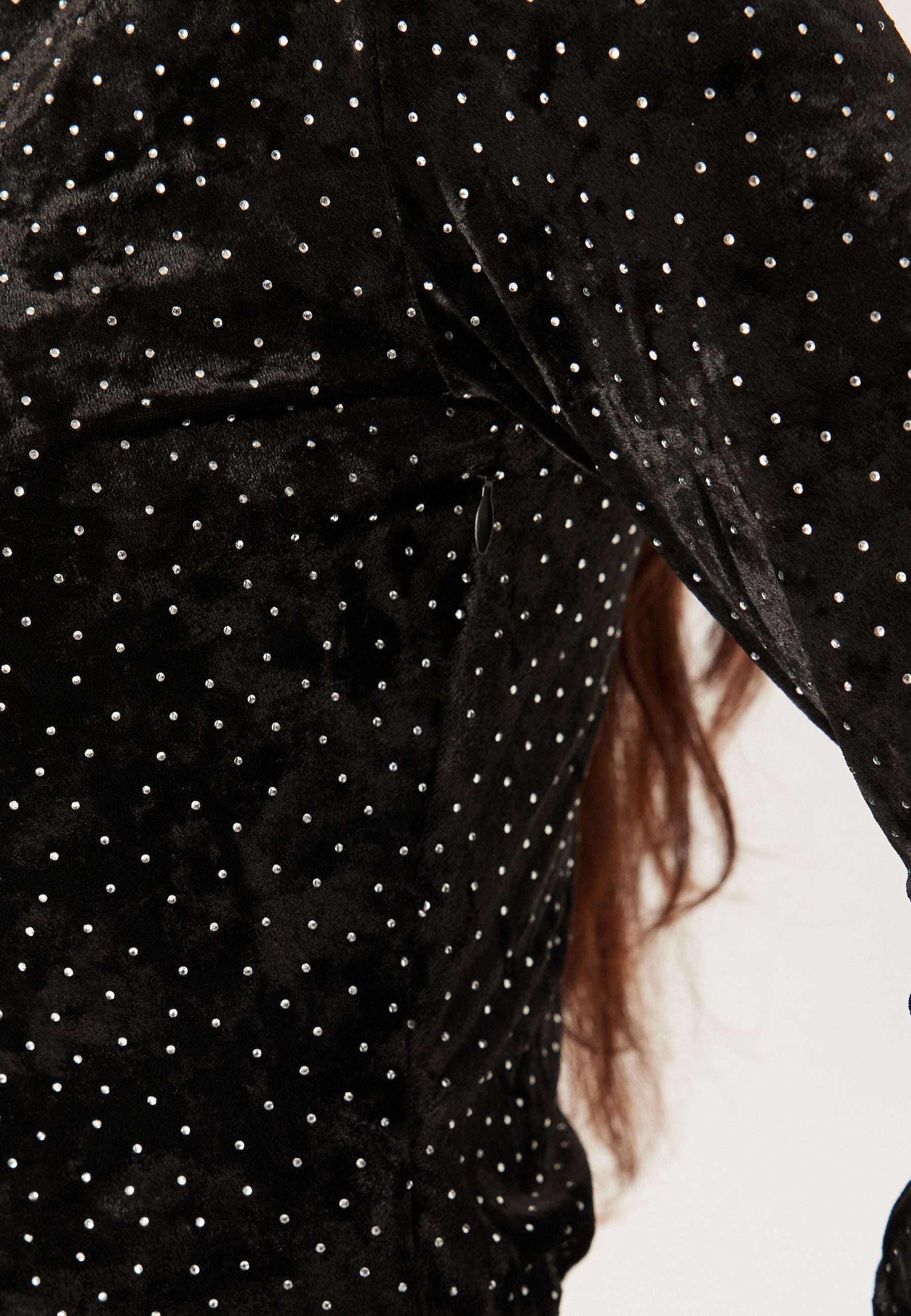 - Stretchy velvet fabric with rhinestone details