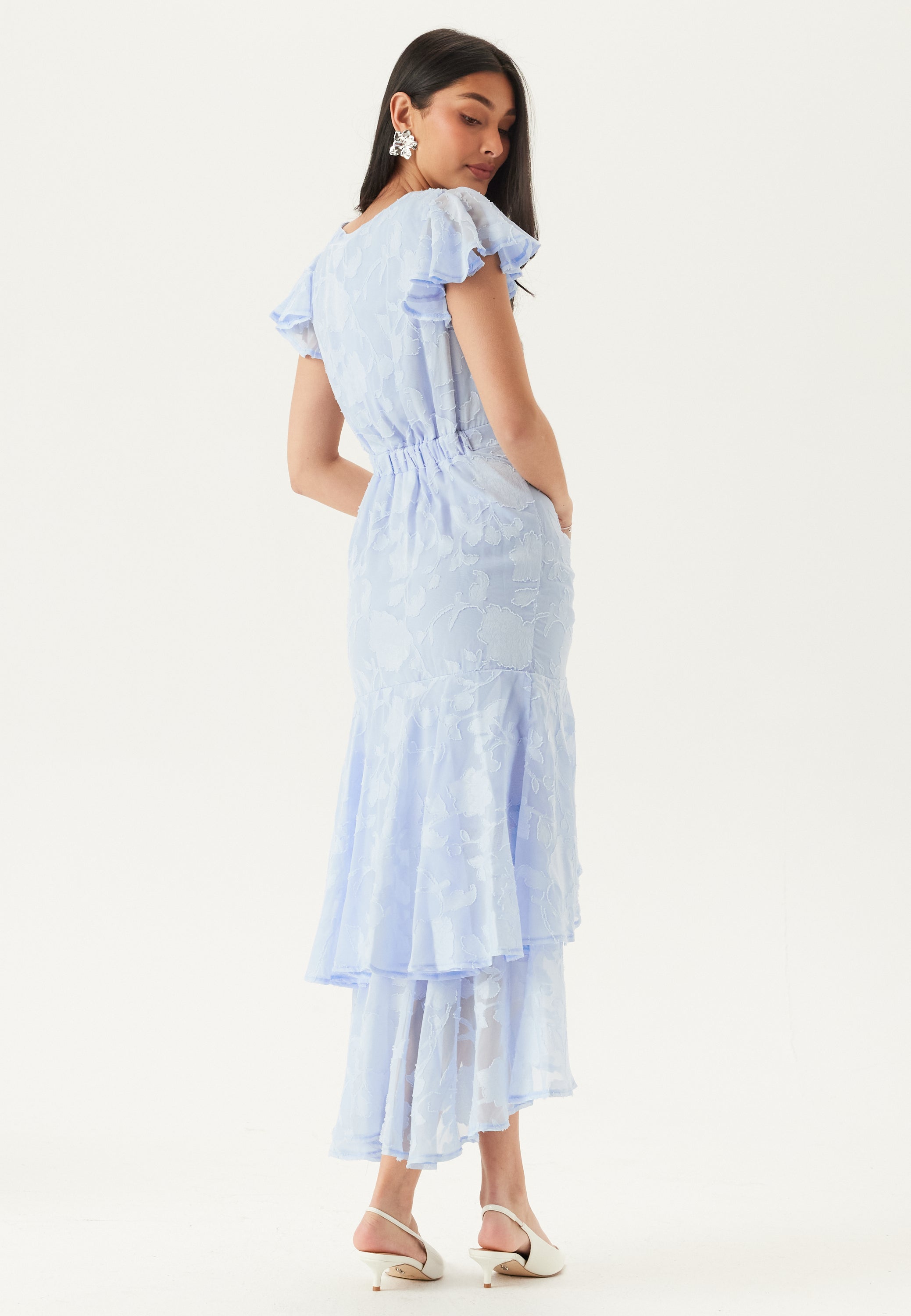Tämä sininen sifonkimekko on helppo valinta häihin, kesäjuhliin ja siistimpiin päivätilaisuuksiin. Pehmeä high-low-helma liikkuu kauniisti kävellessä. V-pääntie, perhoshihat ja etuosan rypytys luovat imartelevan, naisellisen siluetin, joka tuntuu kevyeltä ja erityiseltä ilman että kokonaisuus näyttää liian laitetulta.