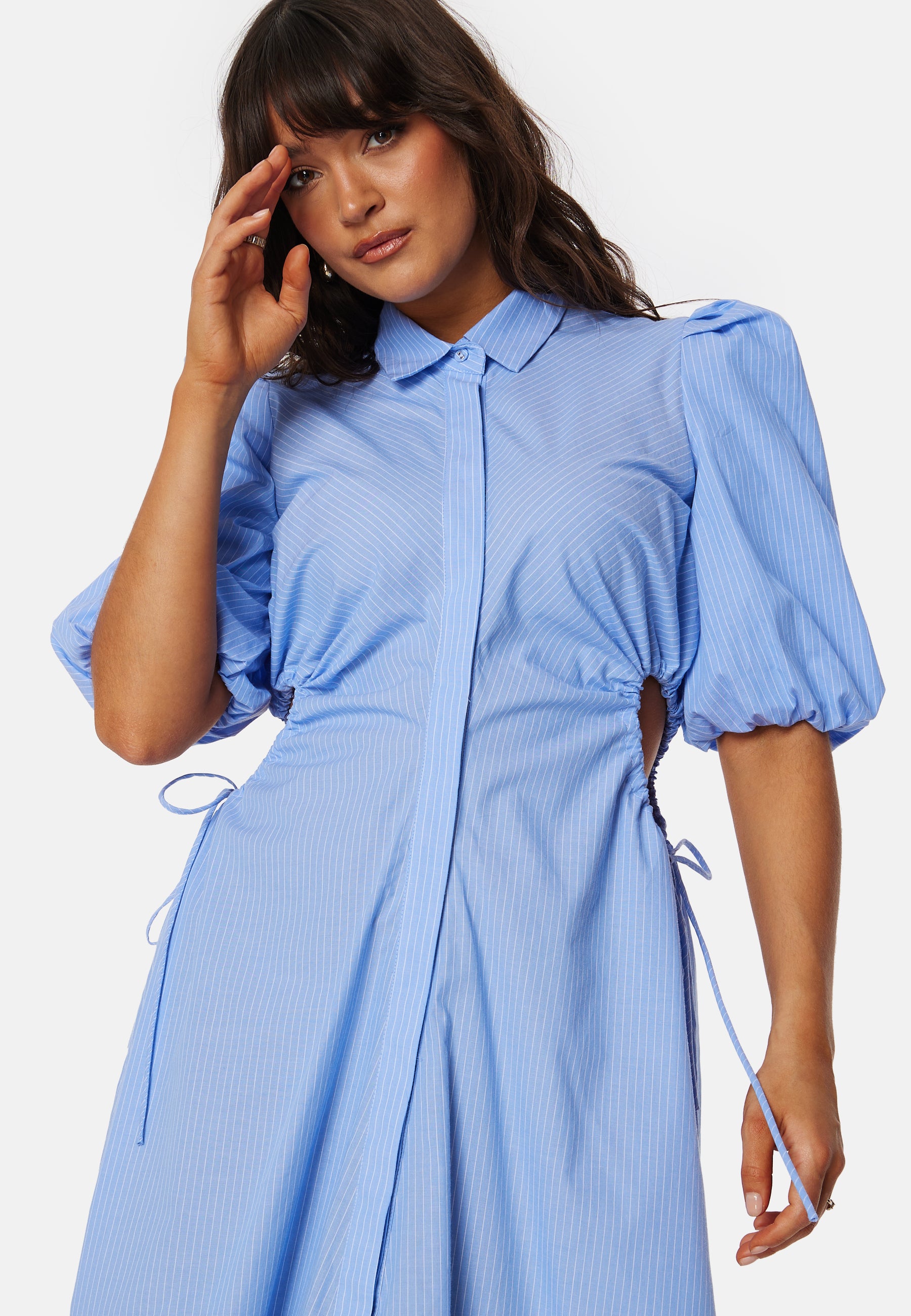 - Korostettu vyötärö säädettävillä leikkauksilla.