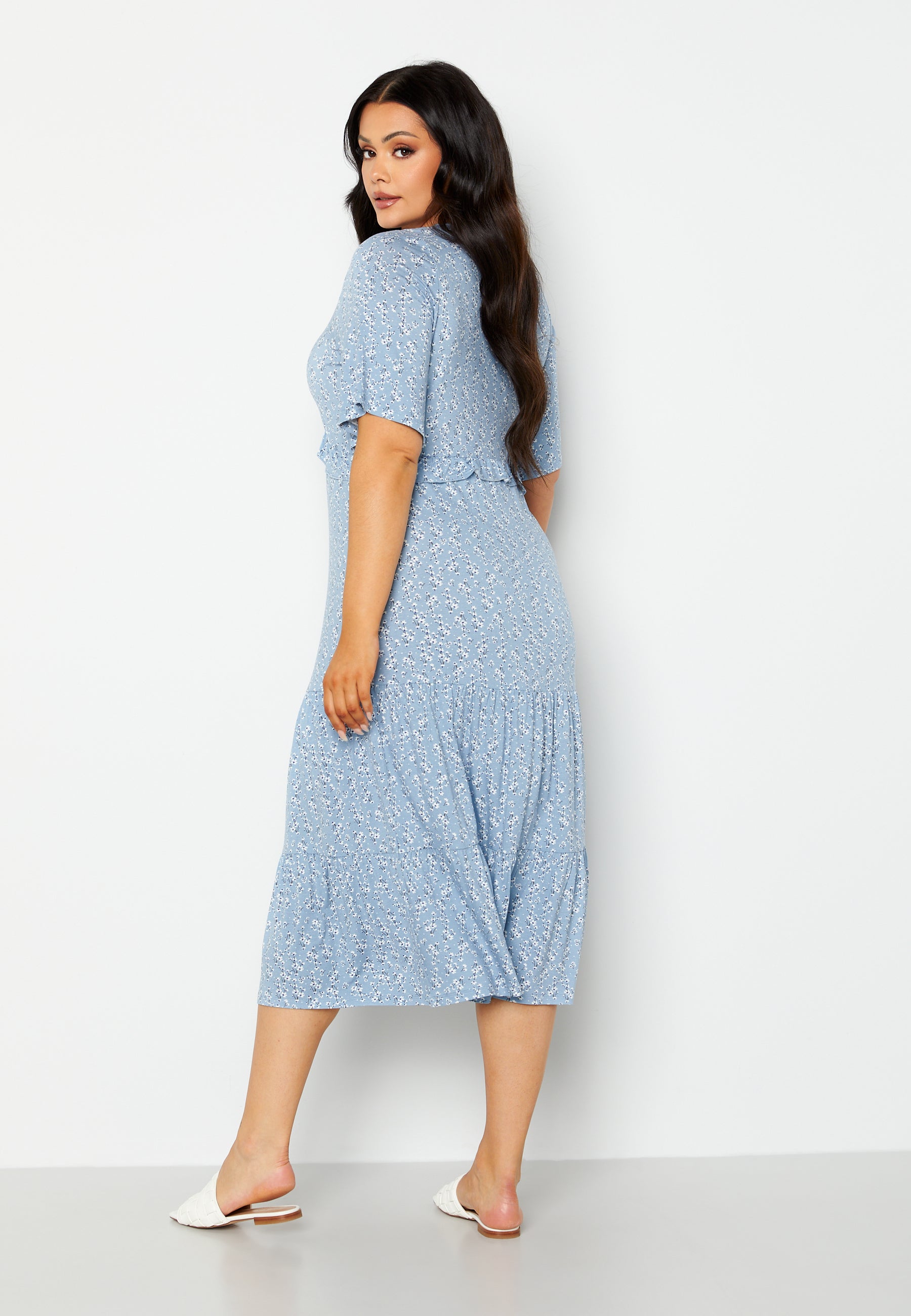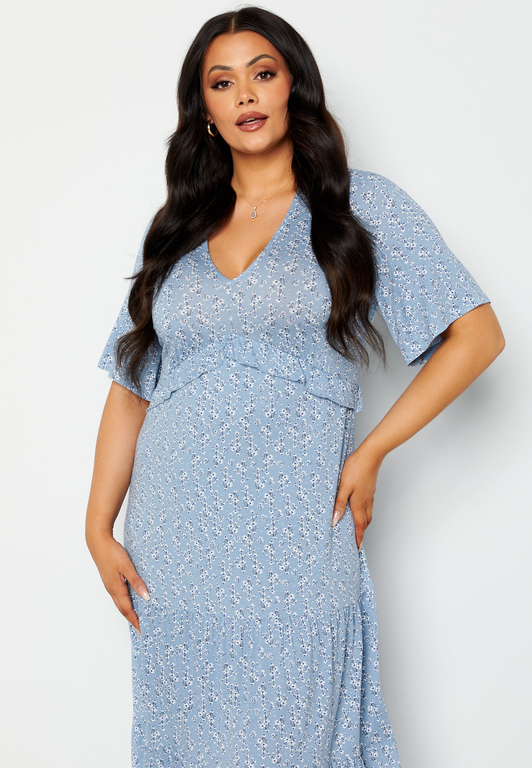 V-kaula-aukkoinen midimekko Happy Holly-tuotemerkiltä.