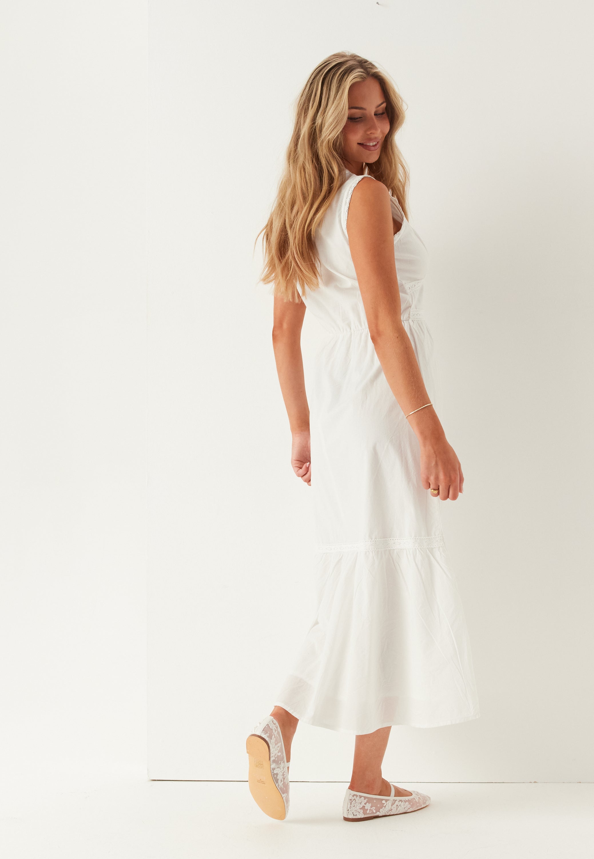 Tämä valkoinen hihaton midimekko on helppo valinta kesään – lämpimiin päiviin, puutarhajuhliin ja rentoihin illallisiin, kun haluat jotain kevyttä, naisellista ja mukavaa. V-pääntietä koristaa pitsireunus, joka tekee ilmeestä pehmeämmän, ja istuva yläosa yhdessä kellomaisen helman kanssa luo kauniin siluetin, joka istuu siististi ylhäältä ja laskeutuu rennosti helmasta.