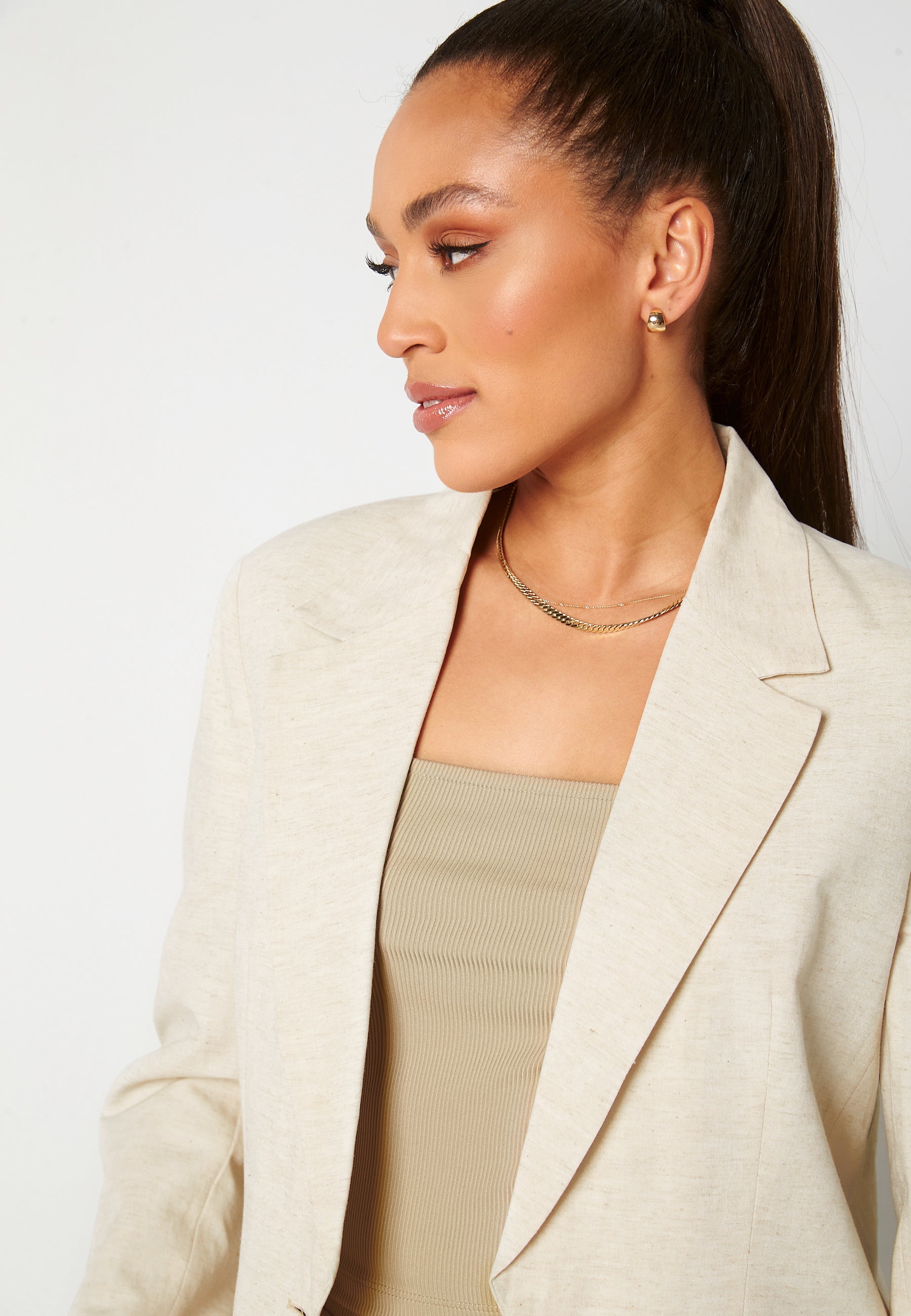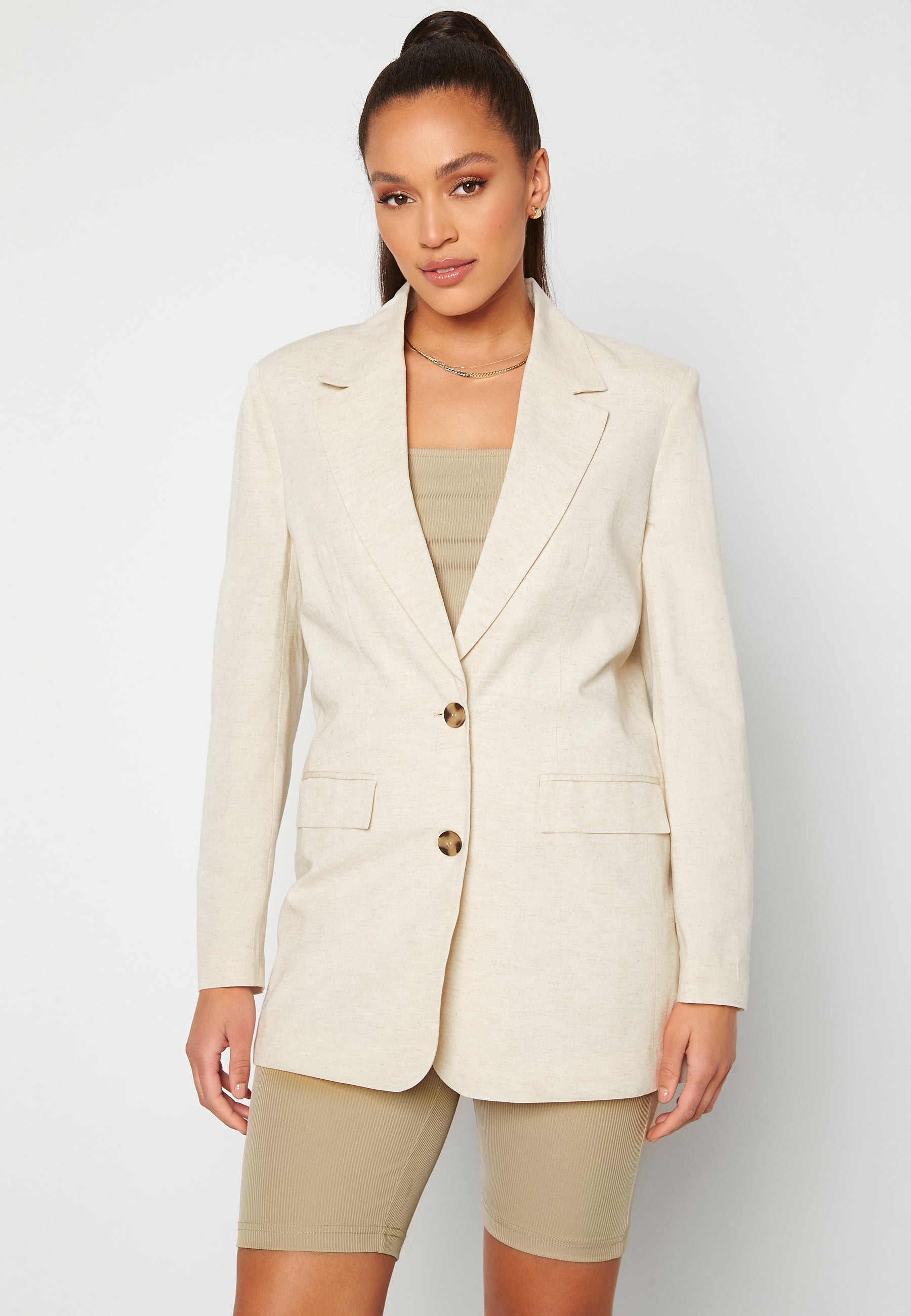 Ylisuuri, trendikäs bleiseri pellava-lookilla.
