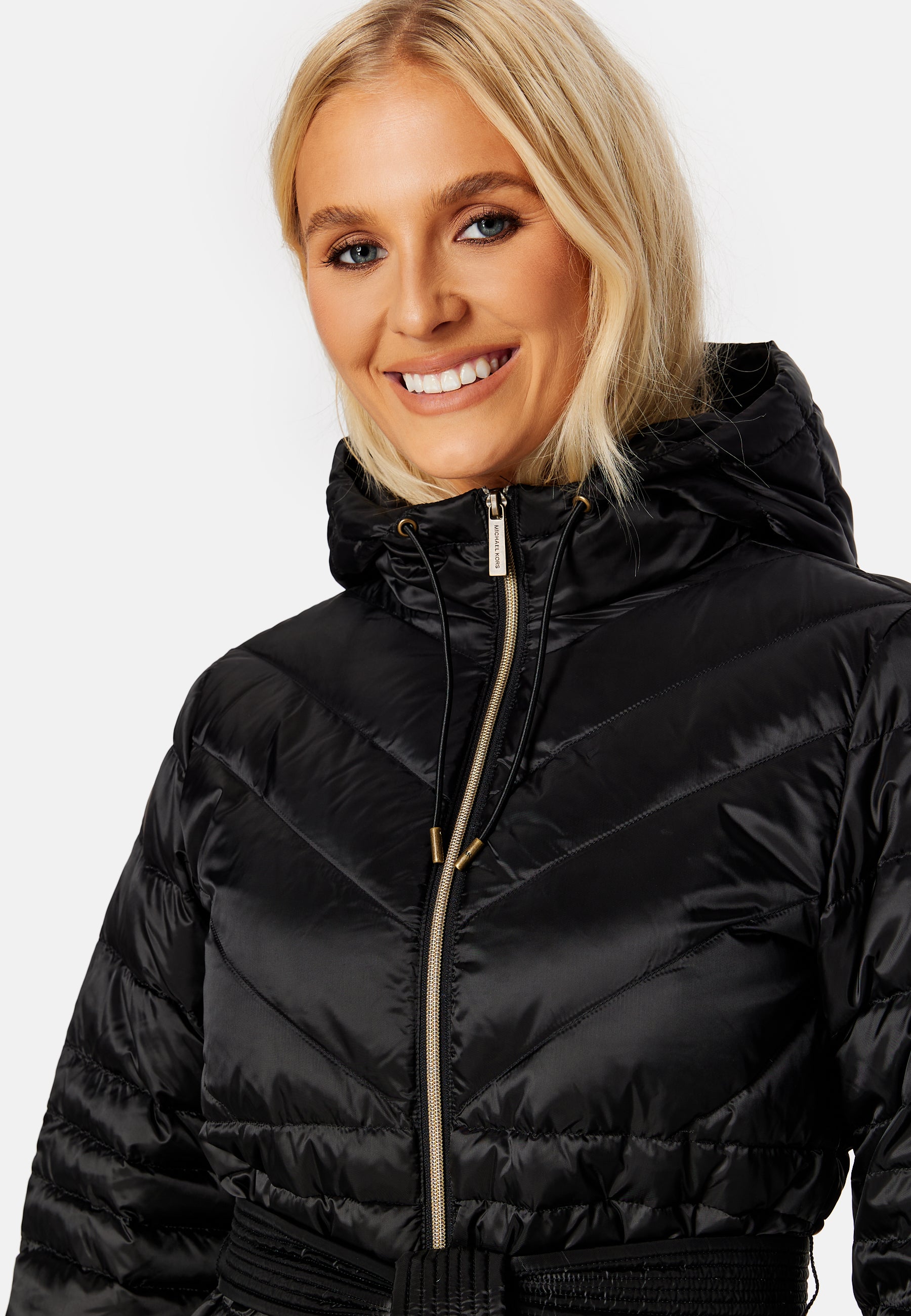 Pitkä untuvatakki Michael Michael Kors-tuotemerkiltä sidottavalla hihnalla.