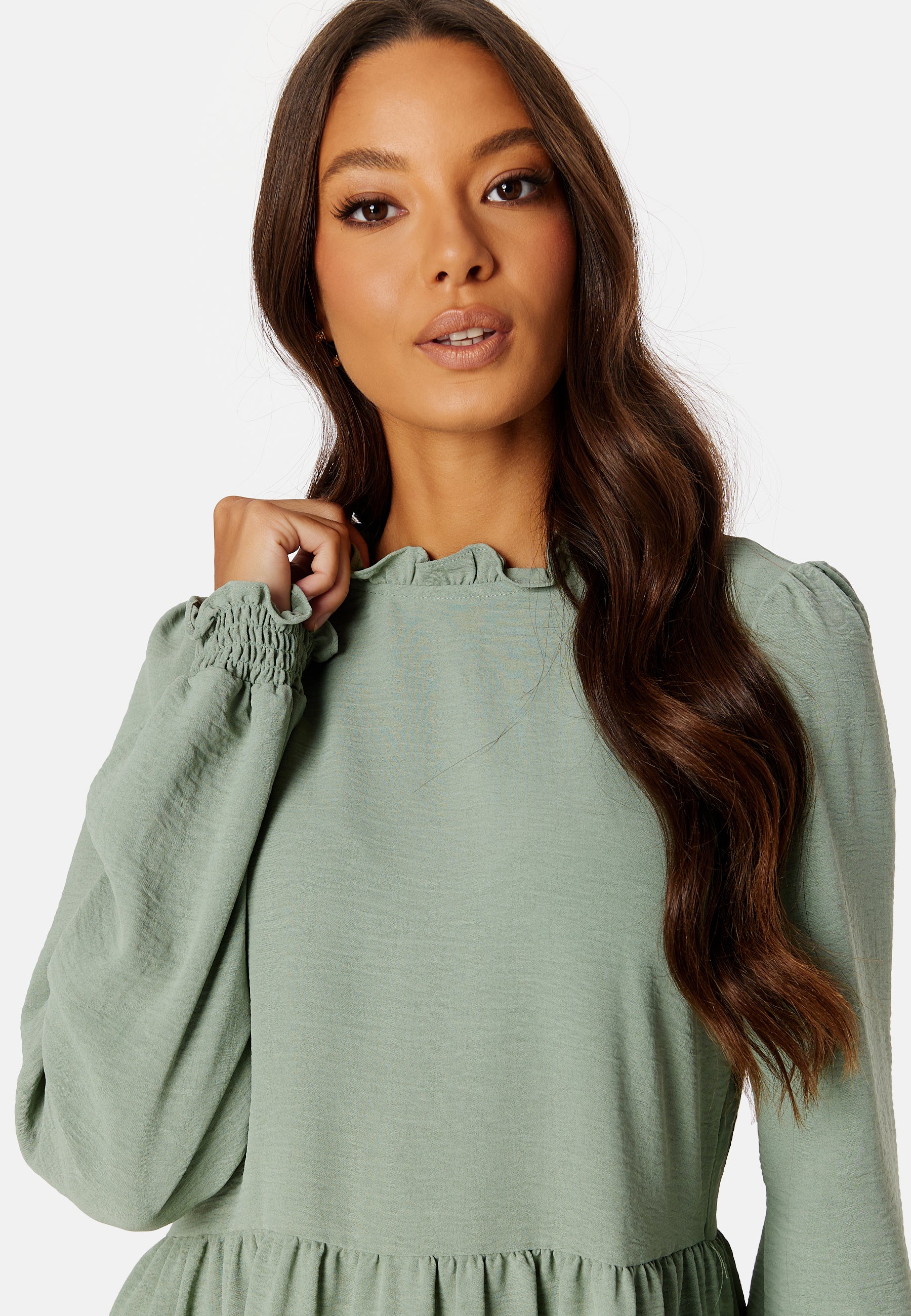 - Korkea kaula-aukko röyhelöllä.