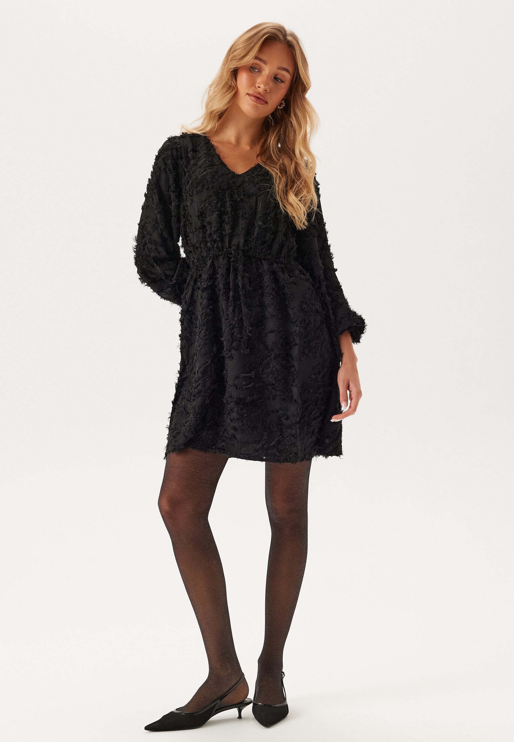 - Korostettu vyötärö kuminauhalla ja koristeellisella solmuyksityiskohdalla.