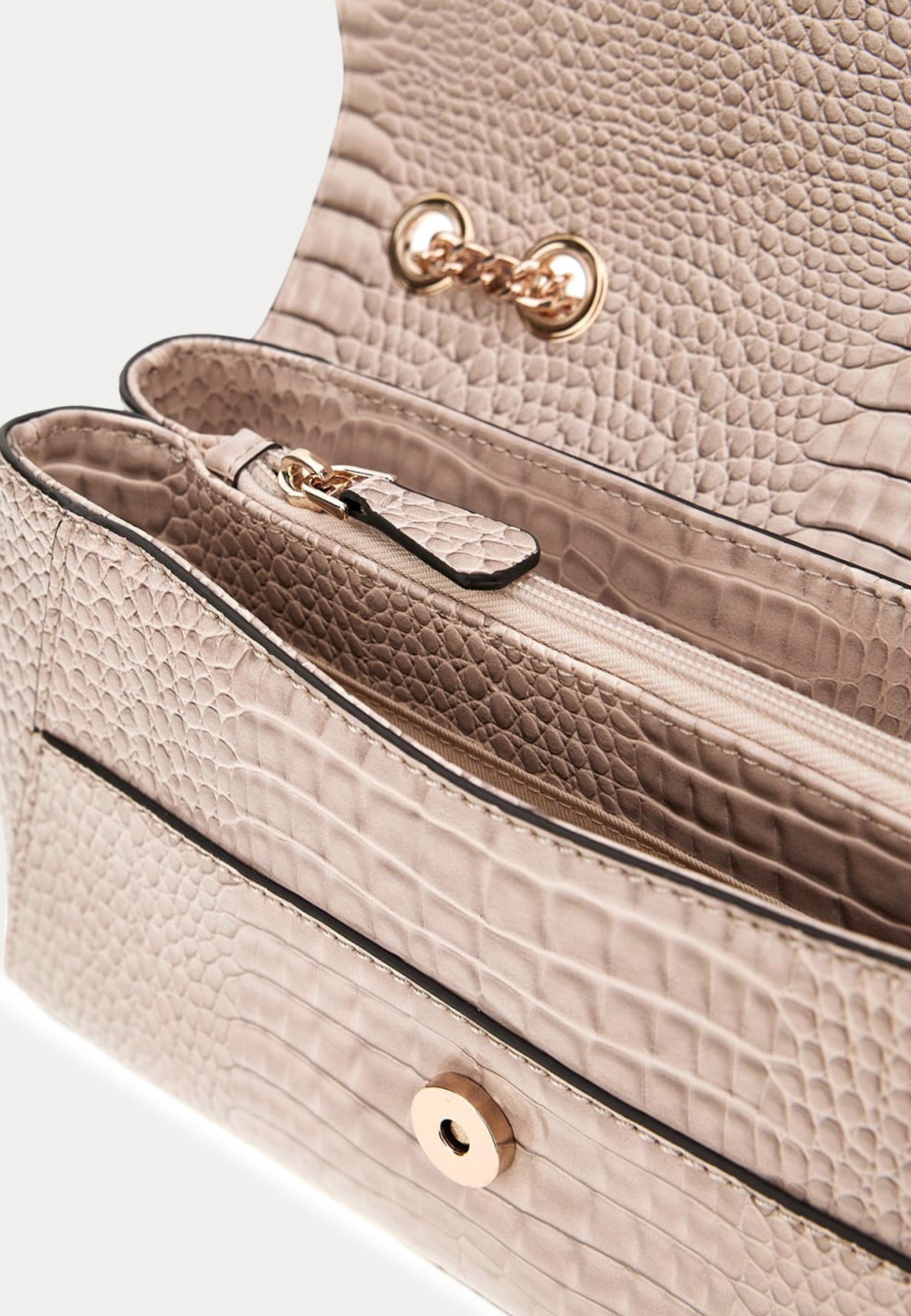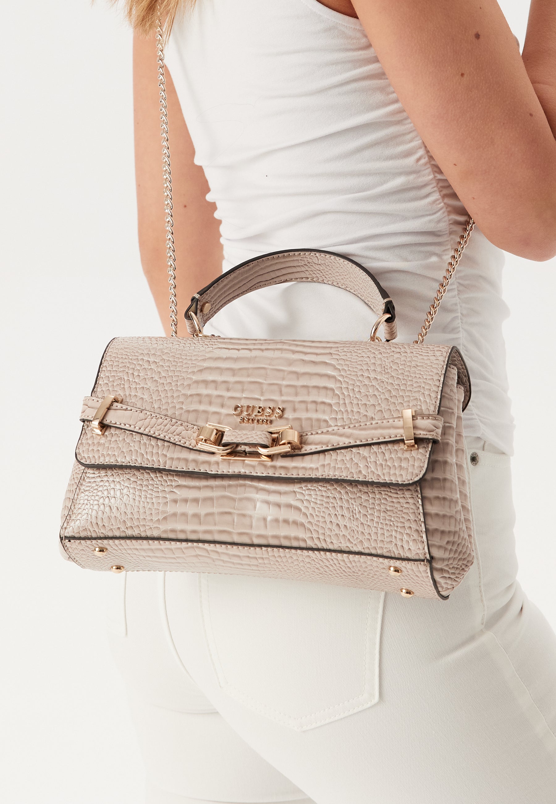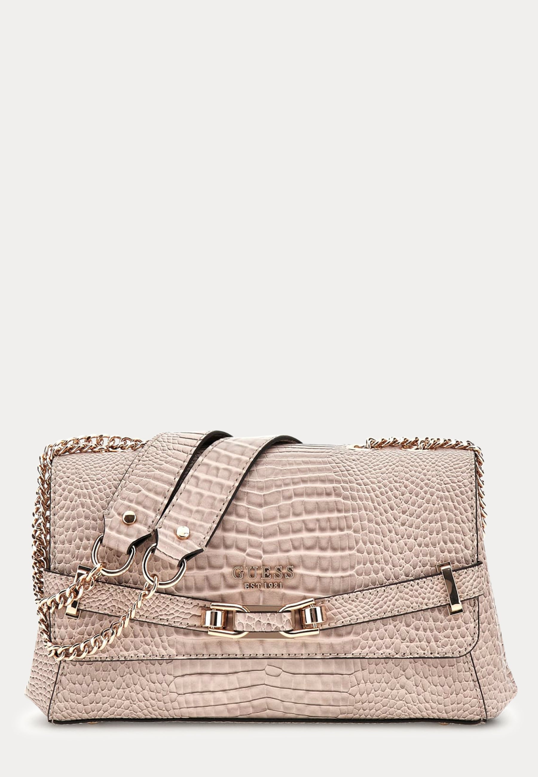 Laukku GUESS-tuotemerkiltä kultayksityiskohdilla.