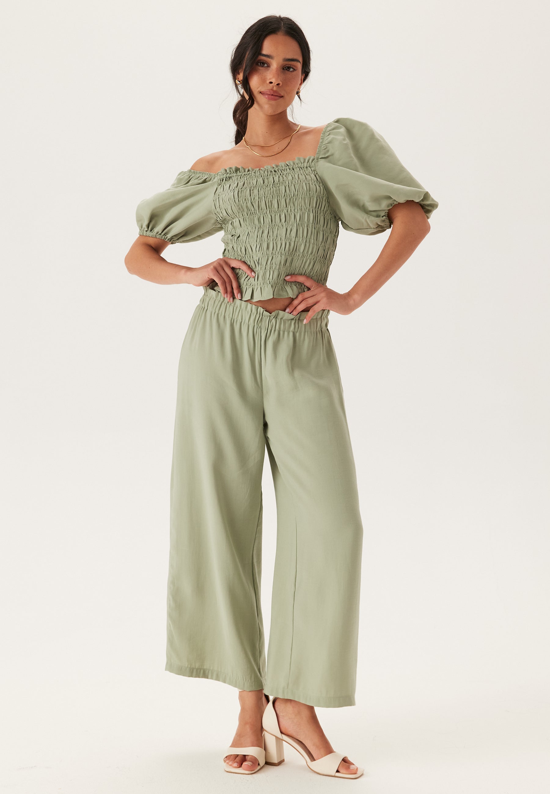 - Puhvihihat kuminauhalla olkapäässä ja hihansuissa