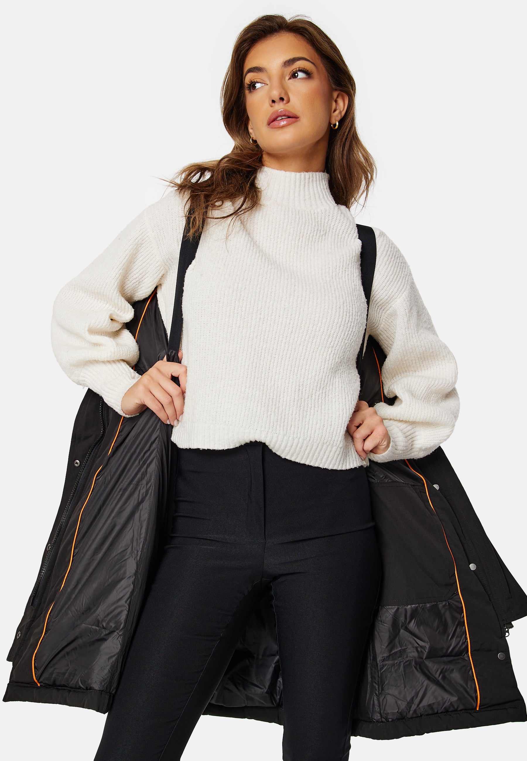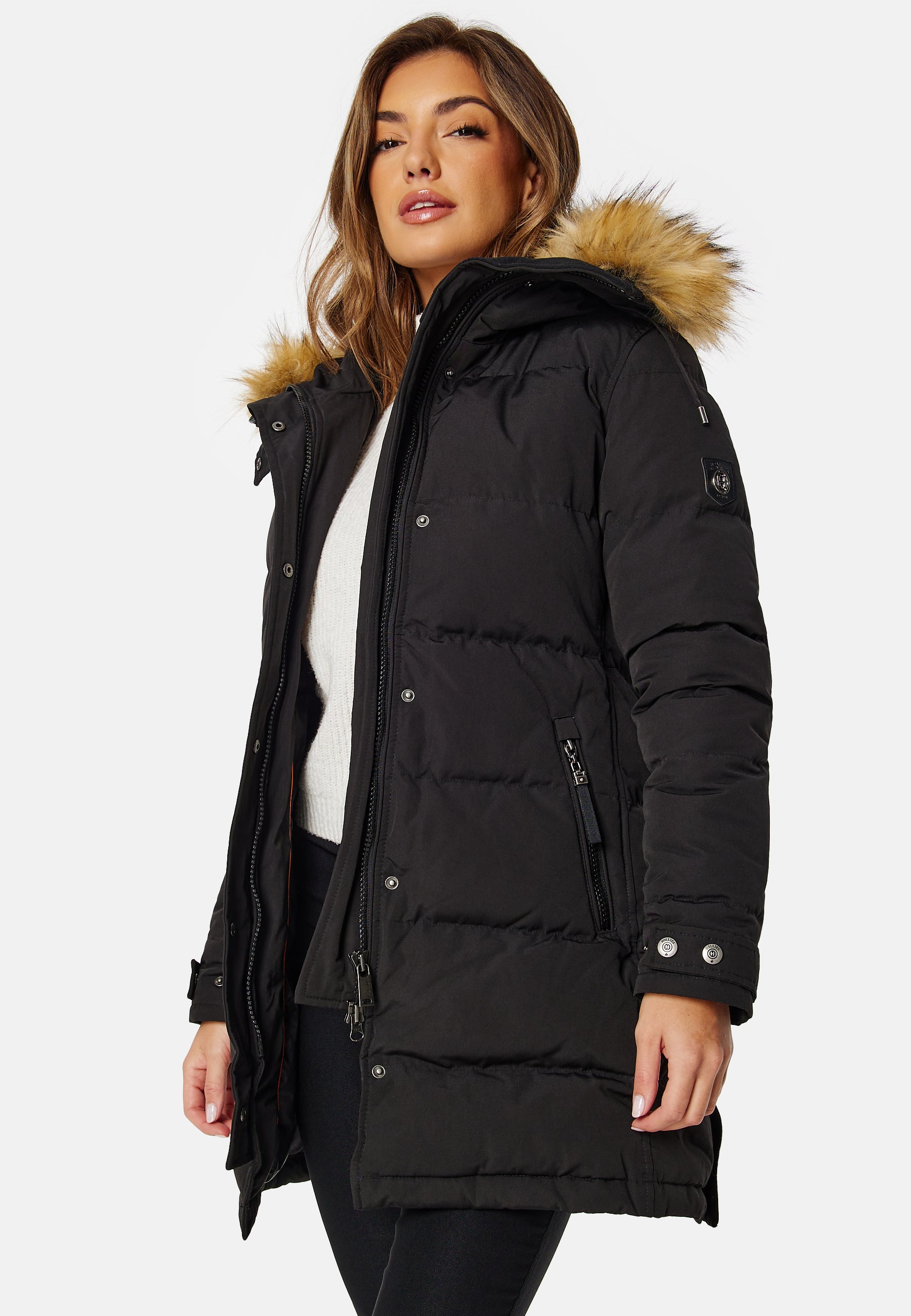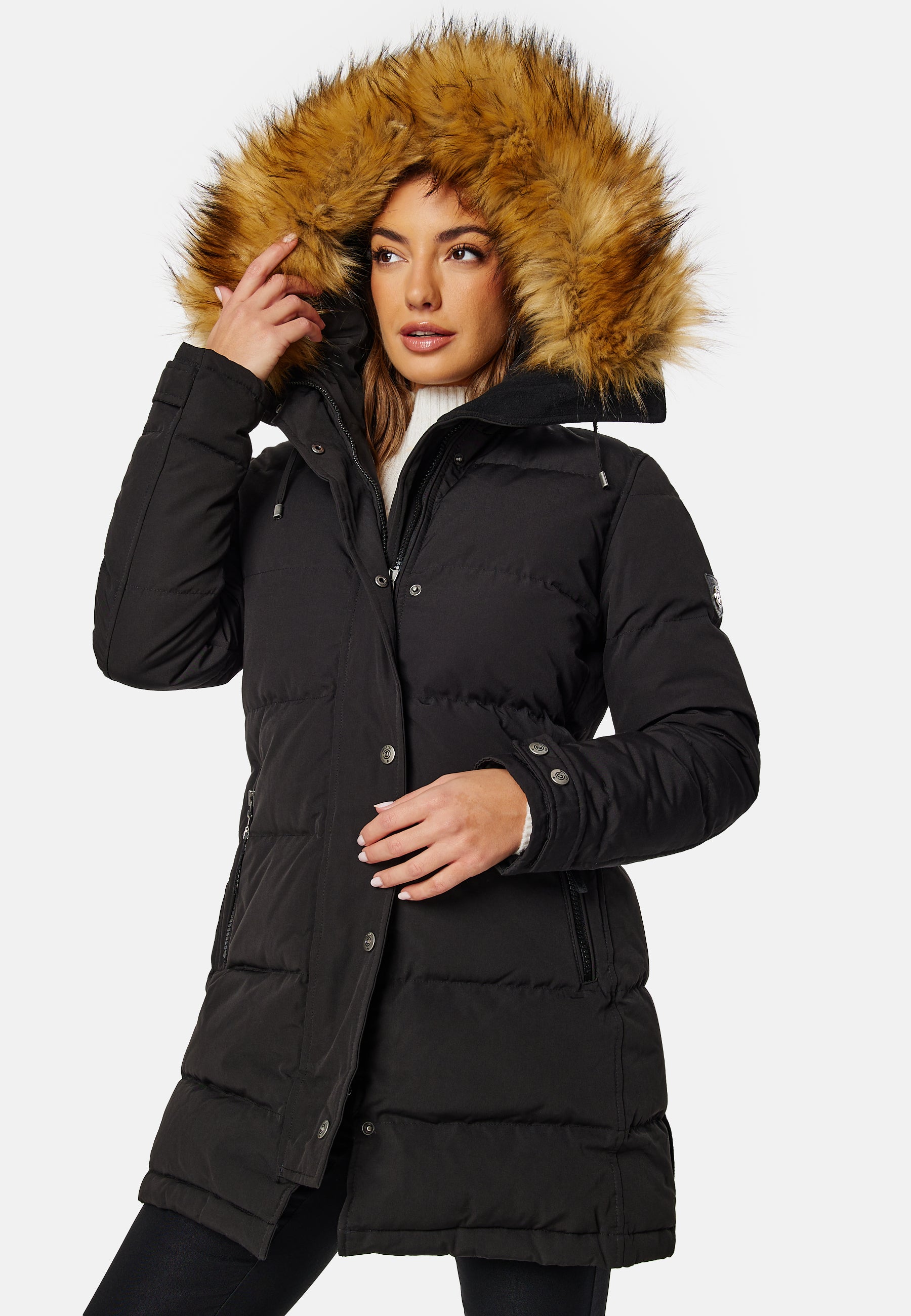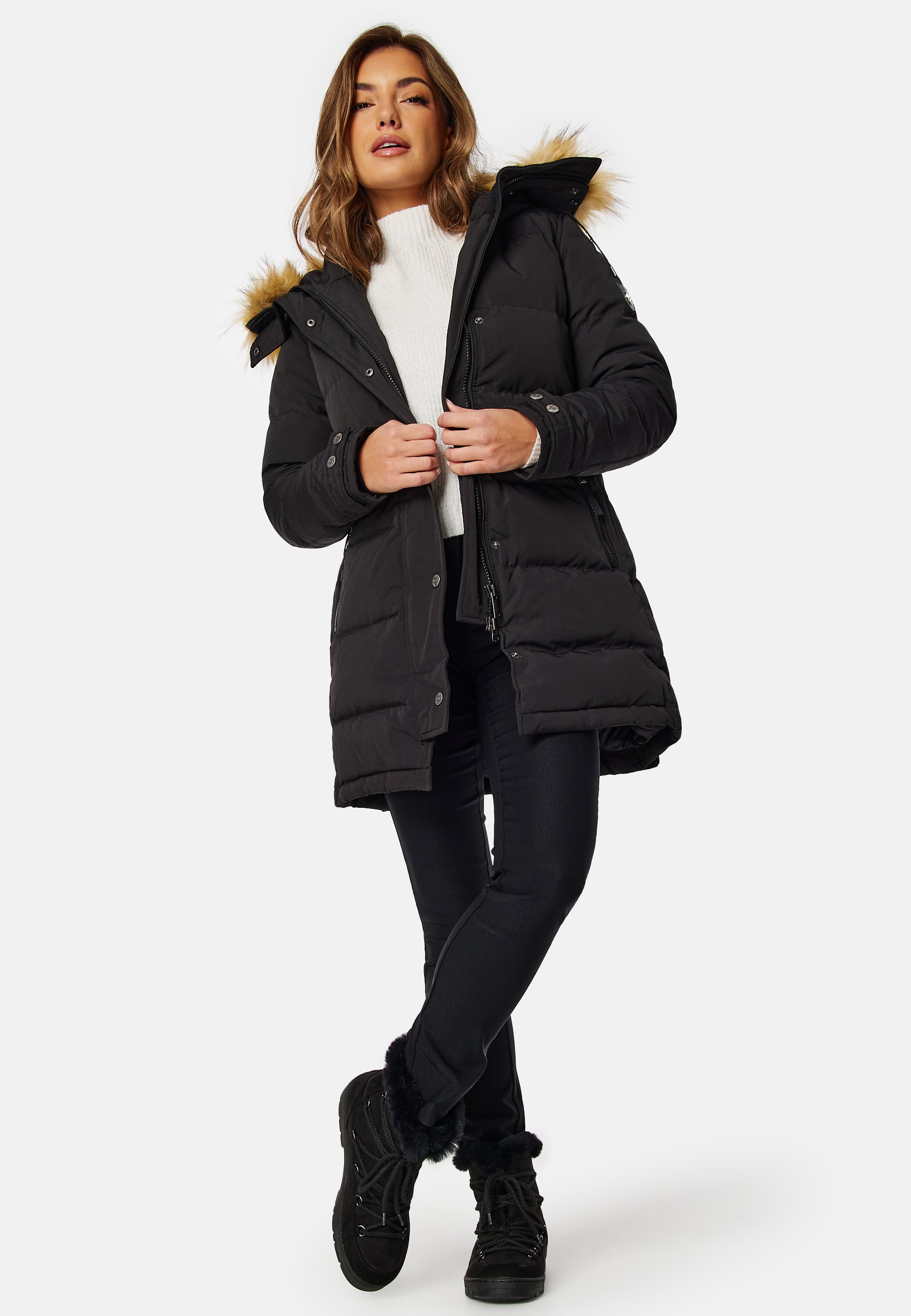 Hollies untuvatakki hieman pidempää mallia. - Edessä vetoketju- Vetoketjulliset taskut- Mukavat resorit hihansuissa - Suuri, irrotettava kaulus turkisjäljitelmää- Yksi sisätasku. Pituus olalta mitattun 84 cm, rinnan ympärysmitta 100 cm, olkapään sauma 64 cm koossa 36. Malli on 175 cm pitkä ja käyttää kokoa 36. Kemiallinen pesu.