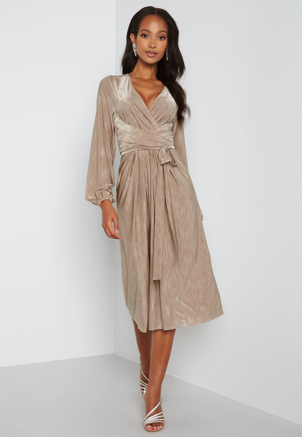 Naisellinen midimekko 12102-tuotemerkiltä poimutetulla kietaisuyksityiskohdalla edessä. Siinä on nyöri vyötäröllä.