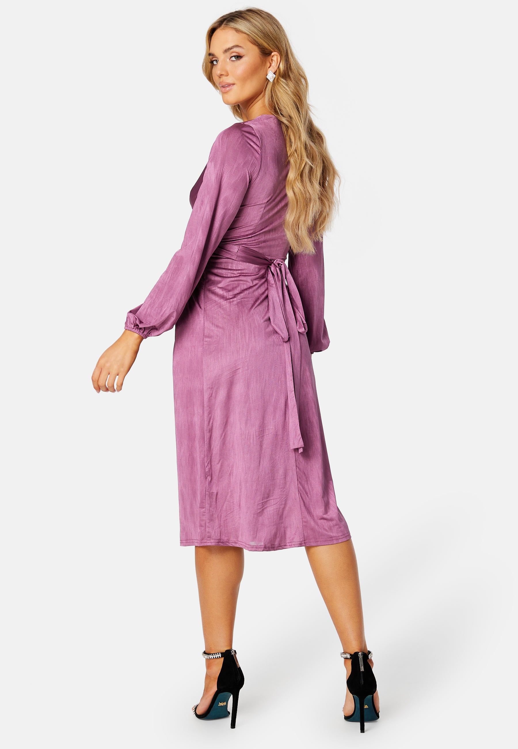 Naisellinen midimekko 12102-tuotemerkiltä poimutetulla kietaisuyksityiskohdalla edessä. Siinä on nyöri vyötäröllä.