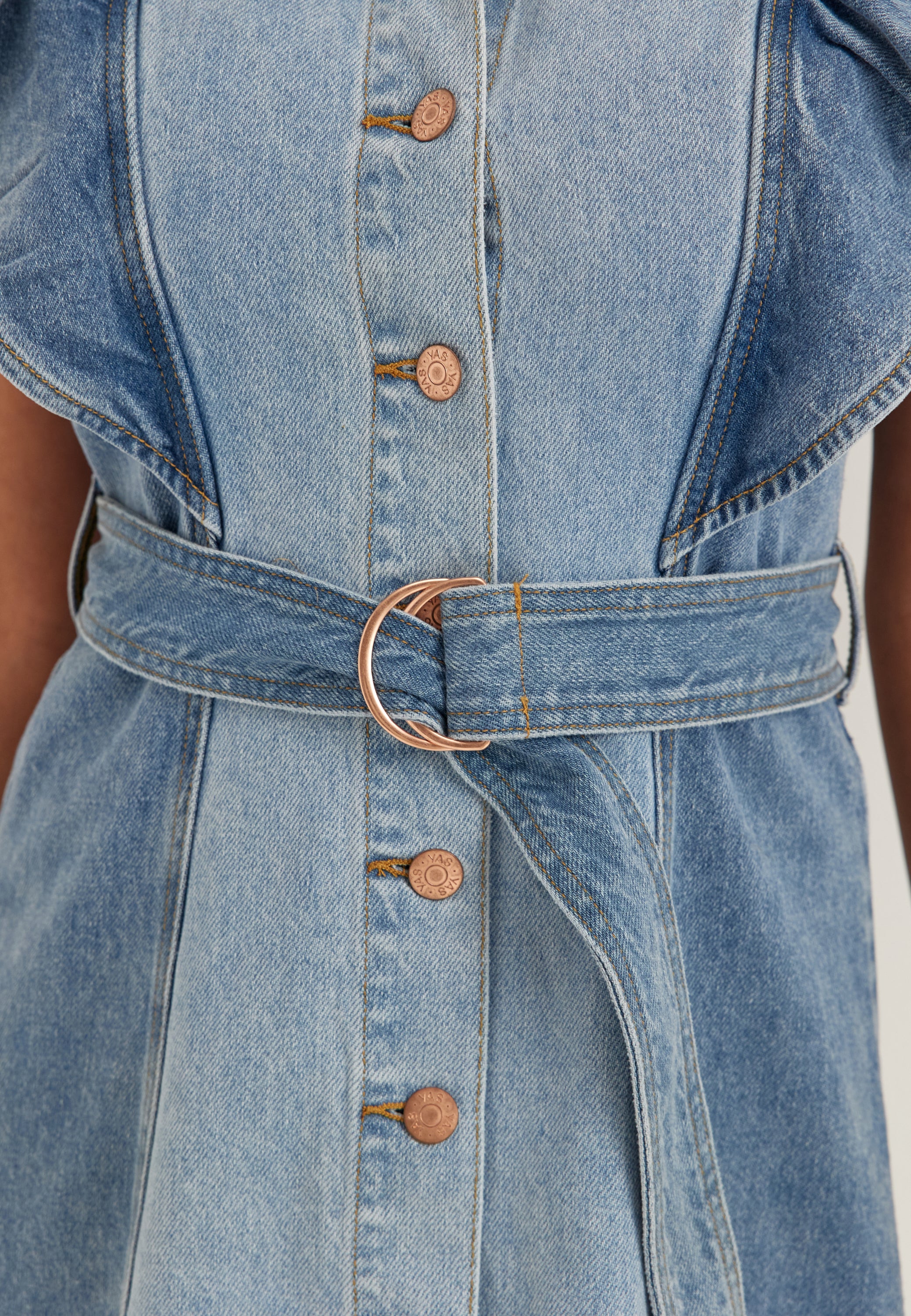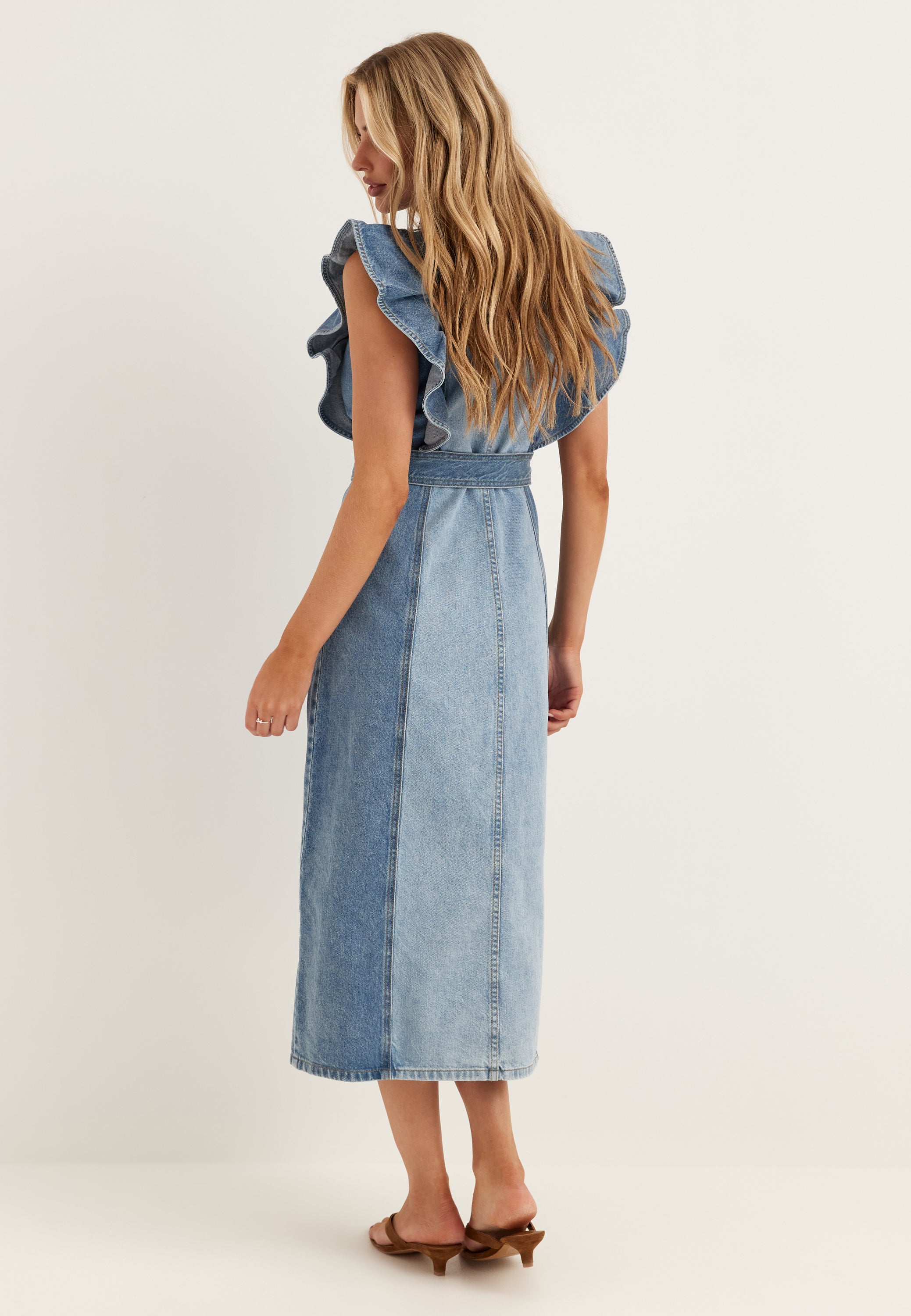 Tämä hihaton farkkumekko keskisinisessä sävyssä on helppo valinta kesän menoihin, viikonloppuihin ja rentoihin illallisiin, kun haluat pukeutua yhdellä vaatteella valmiin näköisesti. Edestä napitettava paitamekon malli pitää ilmeen siistinä ja klassisena, ja olkapäiden röyhelöyksityiskohdat tuovat siihen pehmeämmän ja vähän näyttävämmän viimeistelyn kuin tavalliseen farkkumekkoon.