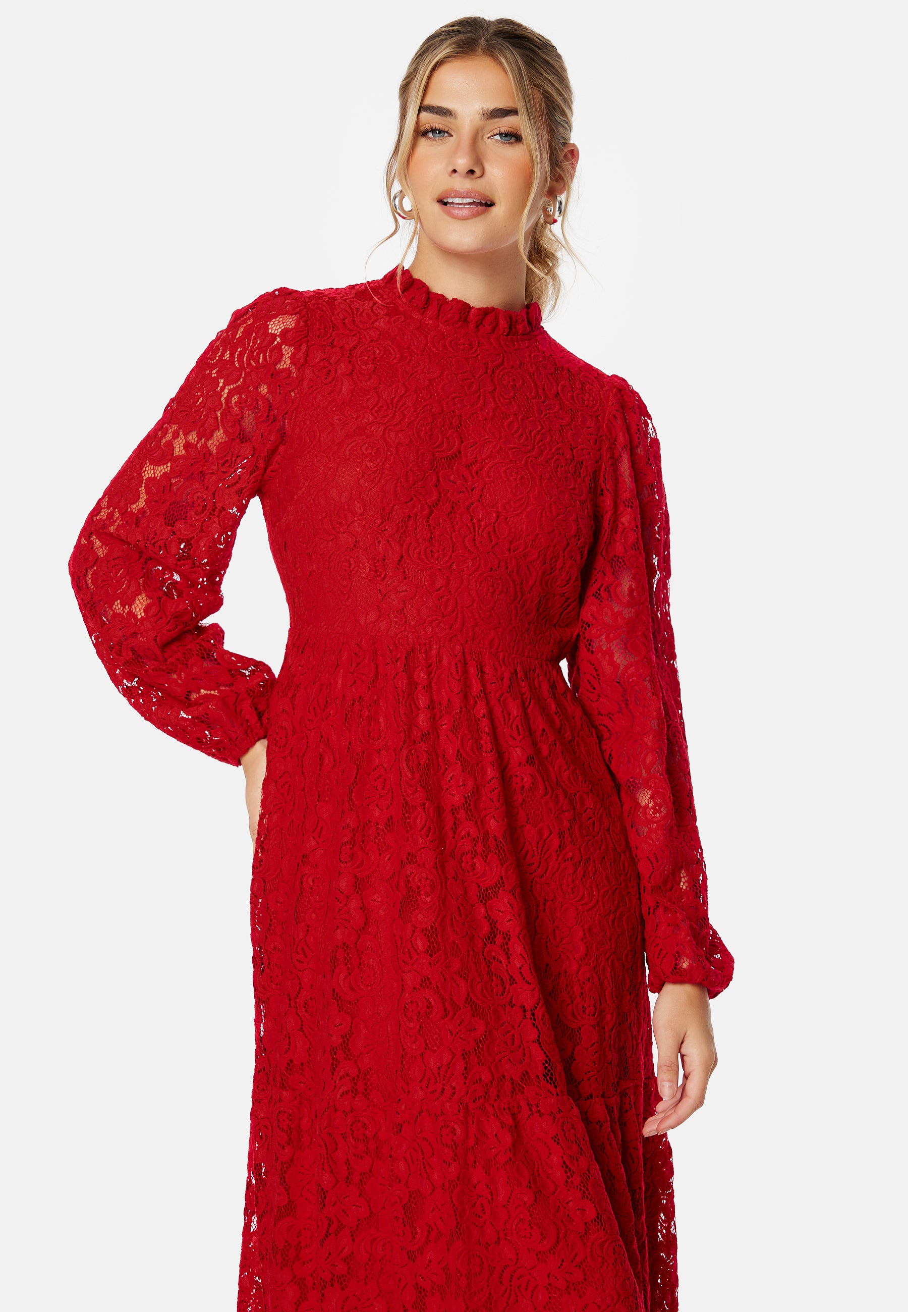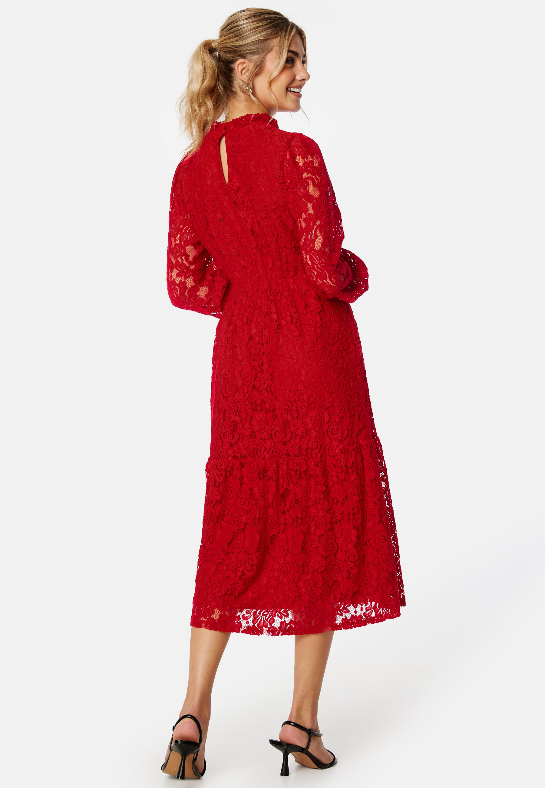 - Hög halsringning med volang