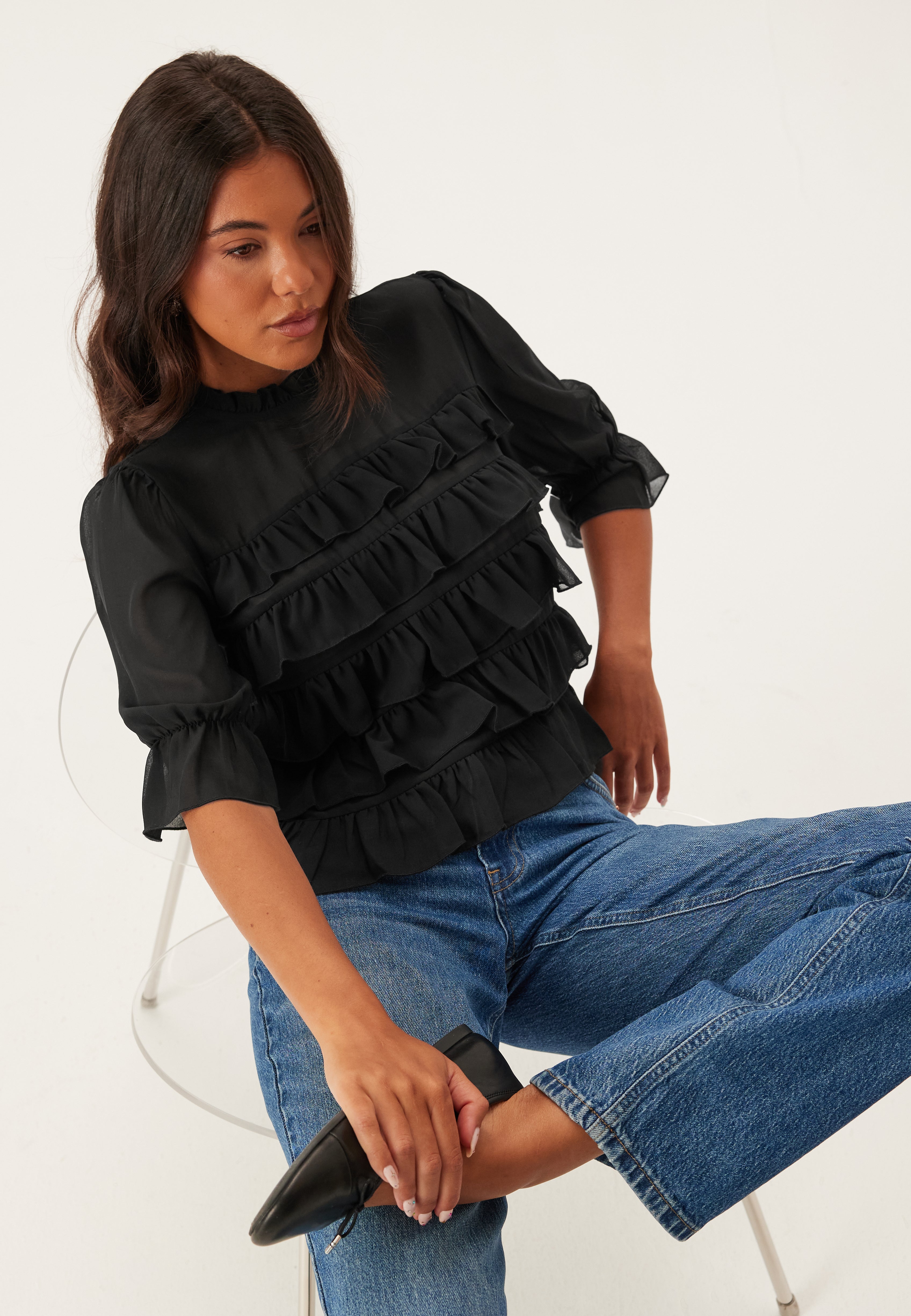 - Puffärmar med volang och resår vid ärmsluten.