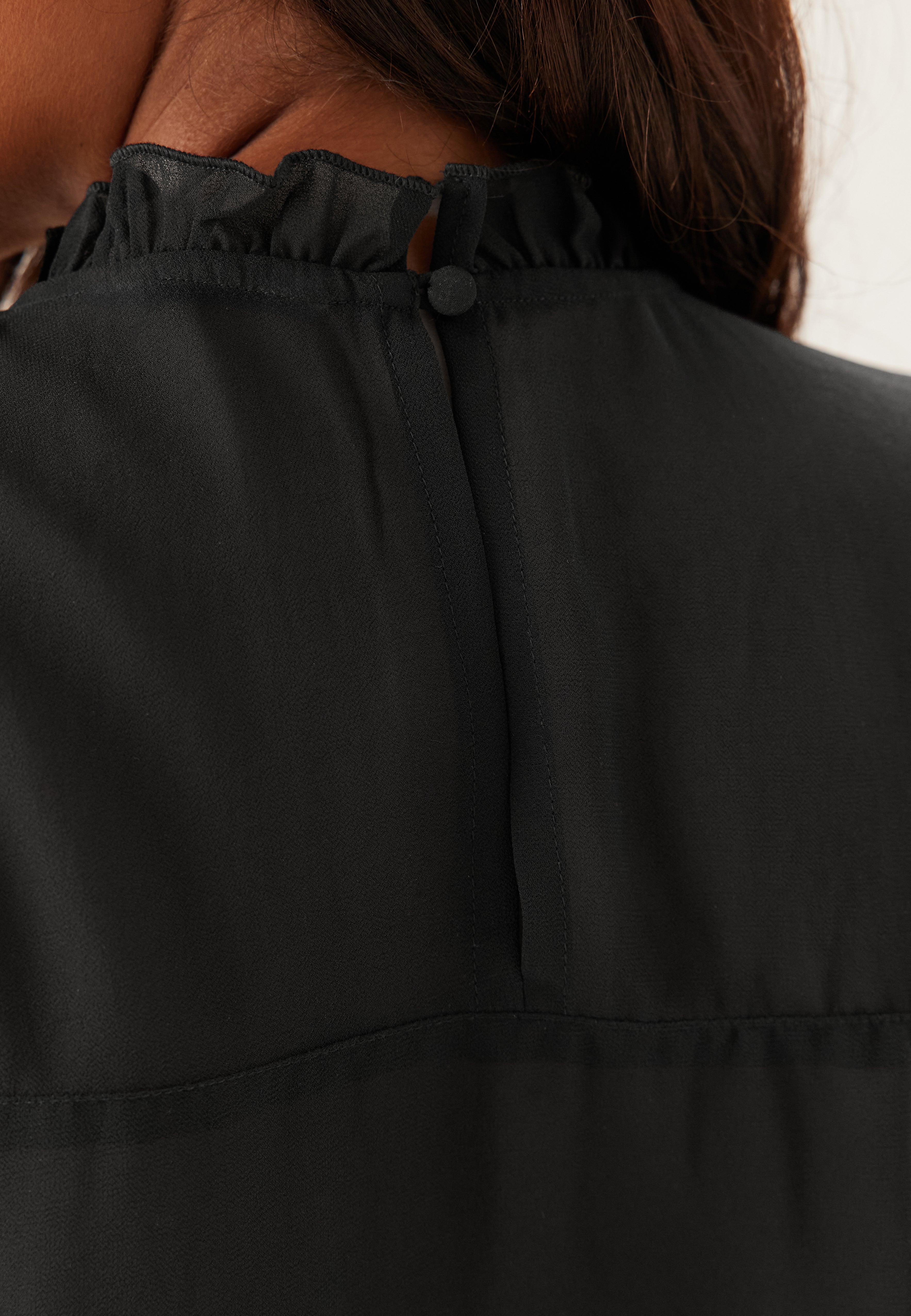 - Rund halsringning med volang och knappstängning i nacken.
