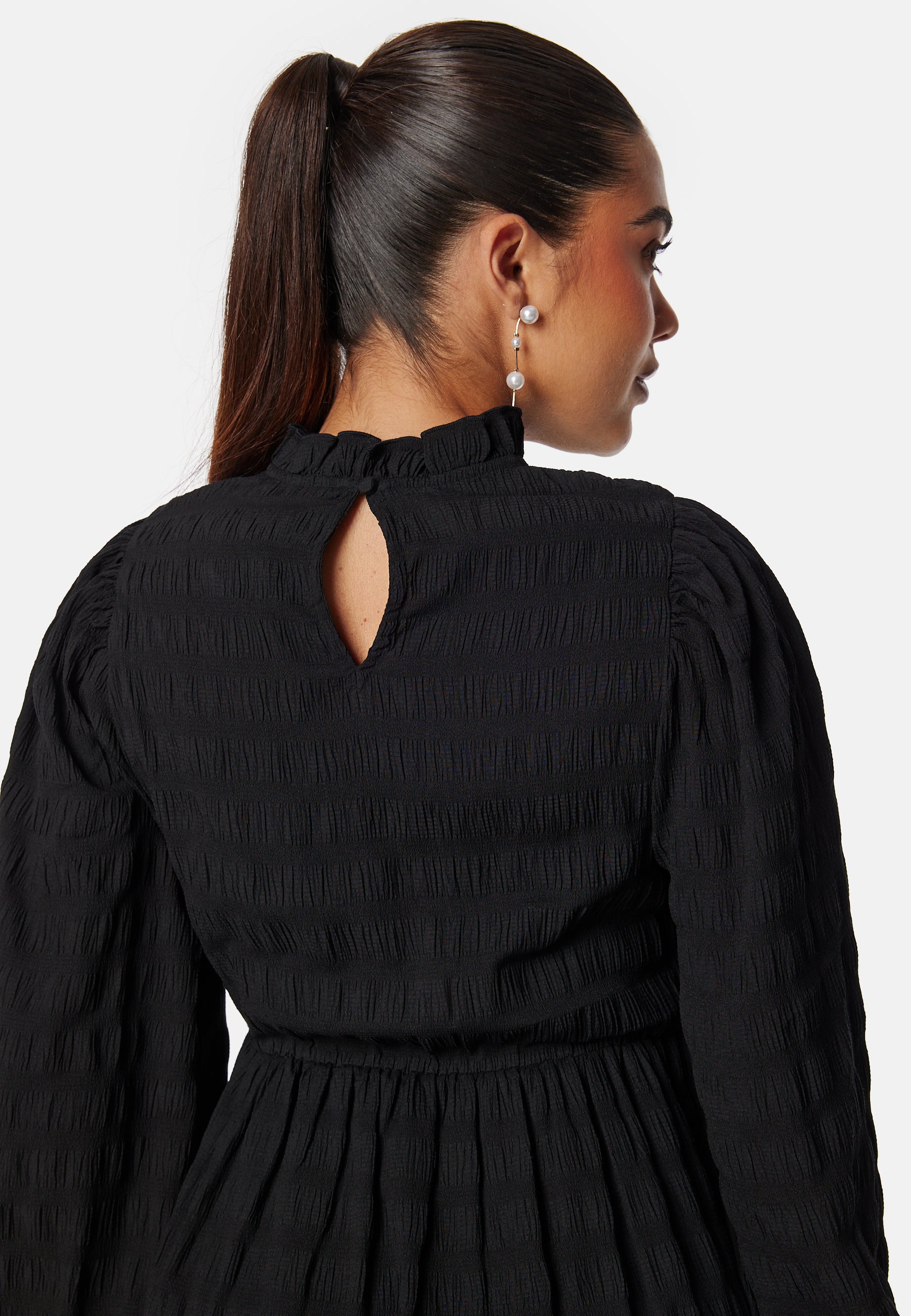 - Rundad halsringning med en volangdetalj.