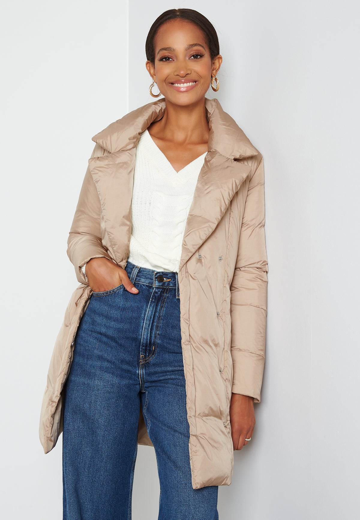 Lång dunjacka.
