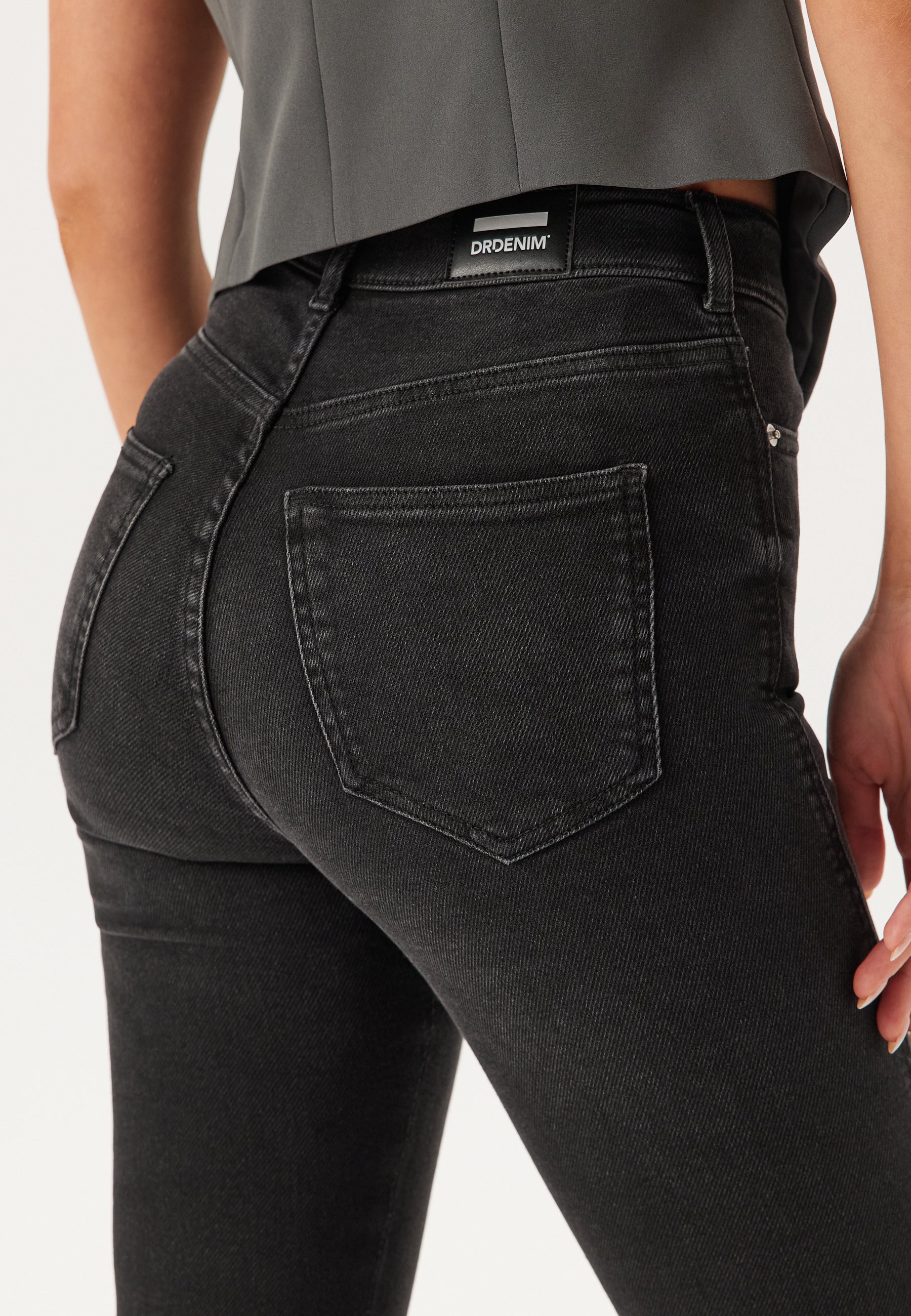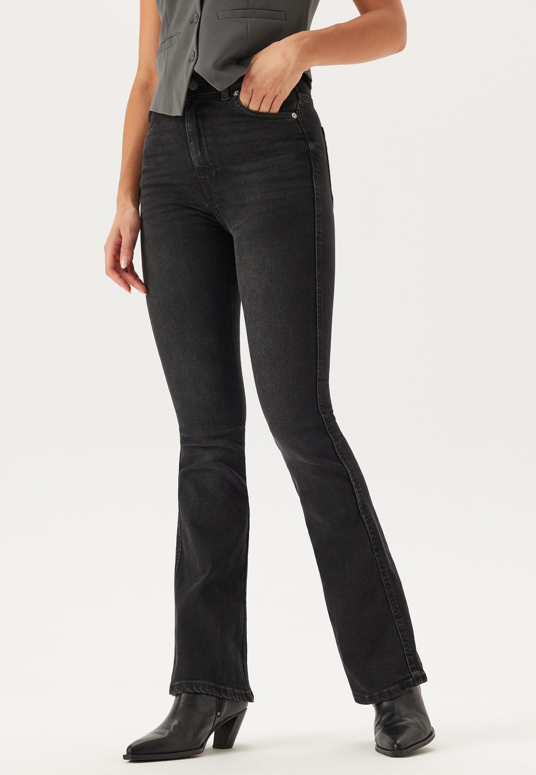 - Figurnära passform upptill med utsvängda ben nertill