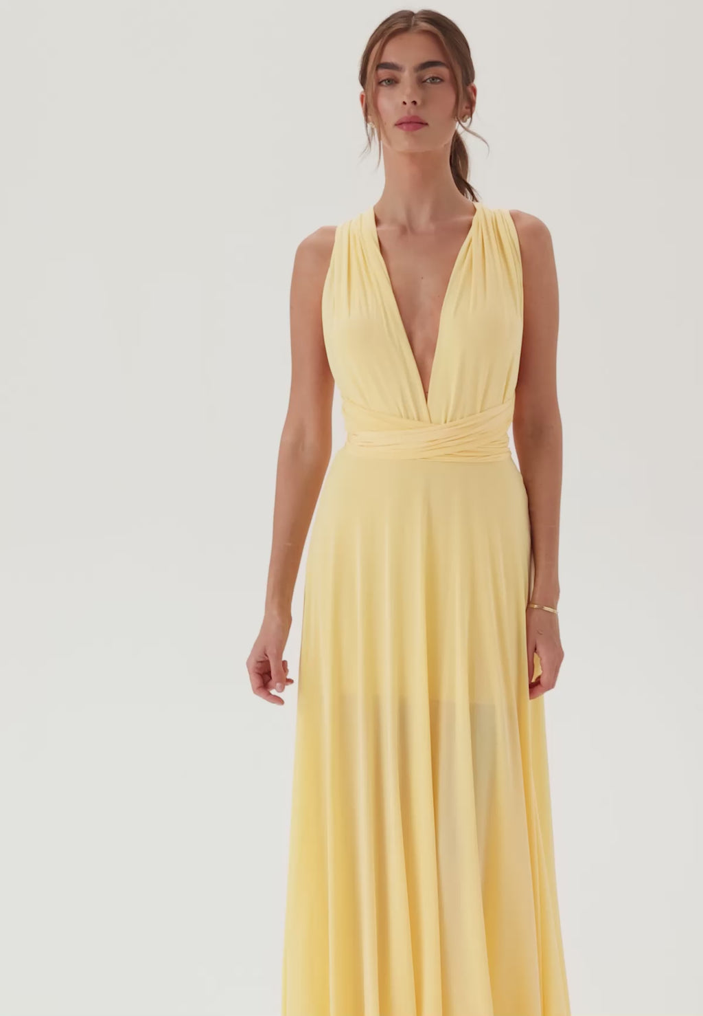 Den här gula maxiklänningen är en mångsidig klänning för brudtärnor och festliga tillfällen, perfekt för bröllop, bal och andra uppklädda event. De knytbara banden kan stylas på flera sätt, så att du enkelt kan ändra både urringning och look efter tillfället. Den mjuka, stretchiga jerseyn faller fint i kjolen, medan den markerade midjan ger en smickrande form som fortfarande känns bekväm även under långa timmar av firande.
