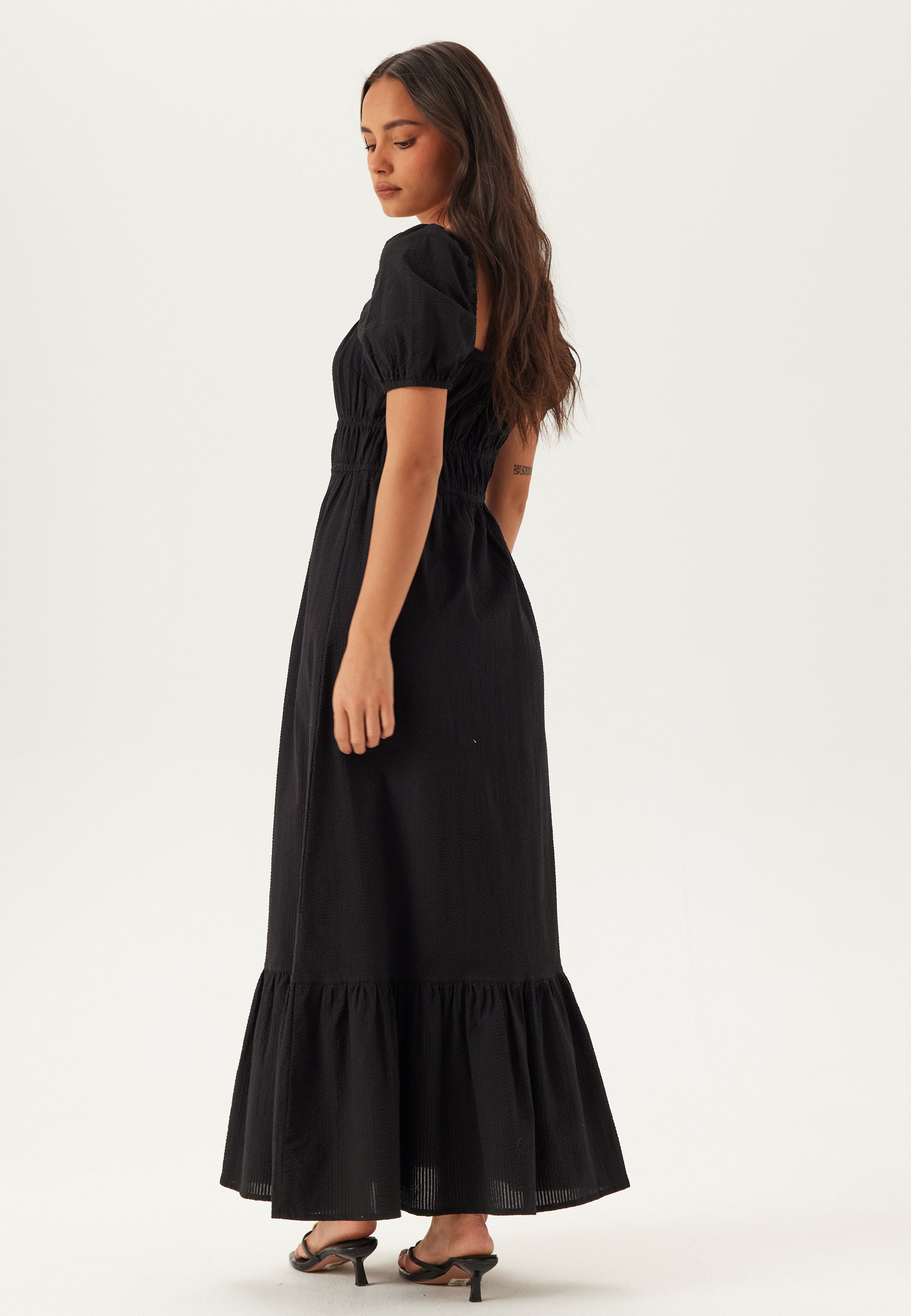 Matcha den med platta sandaler på dagen, eller lägg till sandaler med klack och enkla smycken till middag eller en semesterkväll ute. Det här är en sådan lång svart klänning som är enkel att styla, enkel att bära och ett smart val när du vill ha komfort, fin form och lite extra struktur i ett och samma plagg.