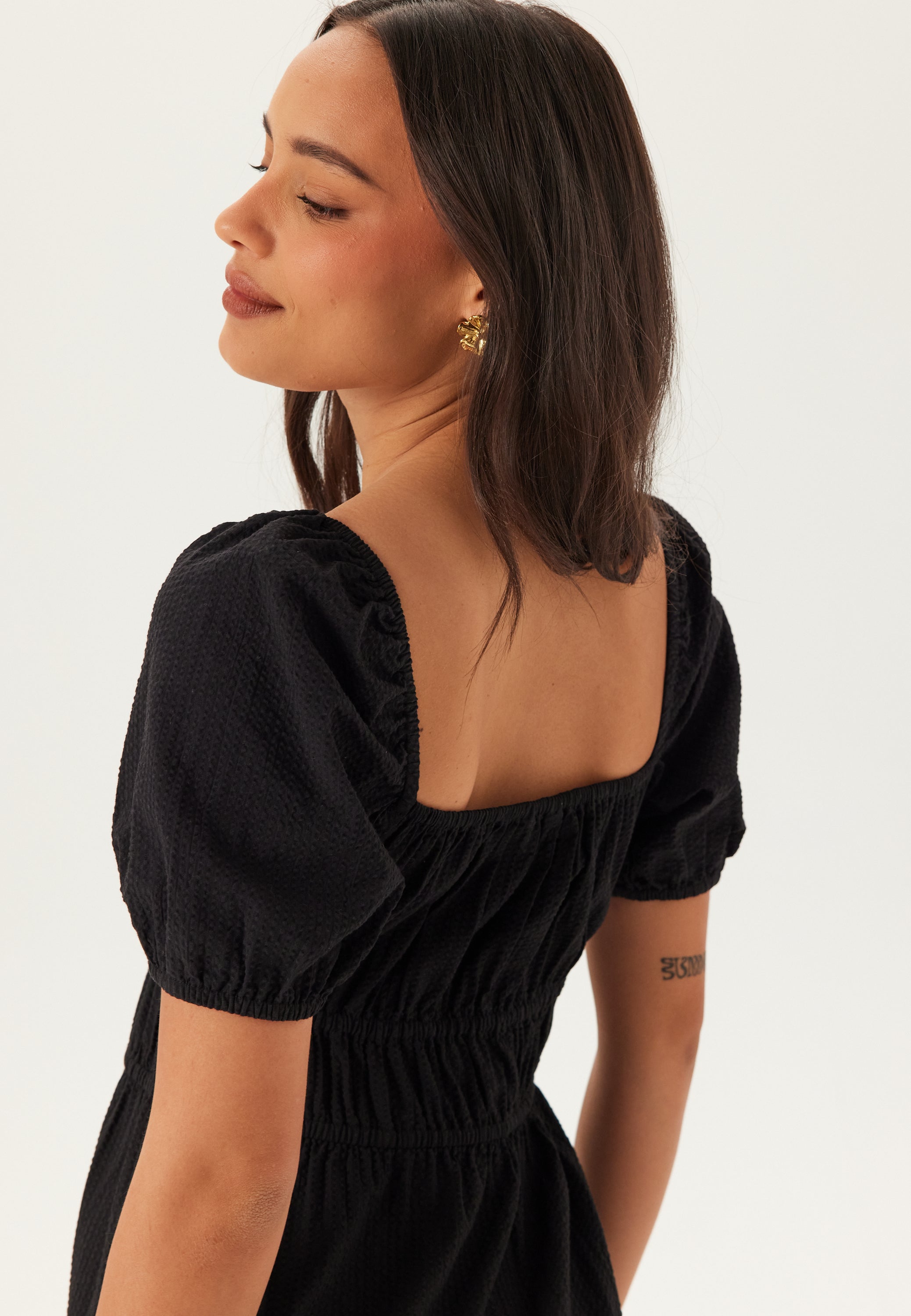 Den här svarta maxiklänningen i bomull är en enkel sommarklänning för varma dagar, helger borta och avslappnade middagar när du vill ha något bekvämt som ändå känns fint och genomtänkt. Den fyrkantiga ringningen och den mjukt rynkade överdelen ger en ren, feminin form, medan den markerade midjan med elastiska detaljer skapar en smickrande passform utan att kännas stram.