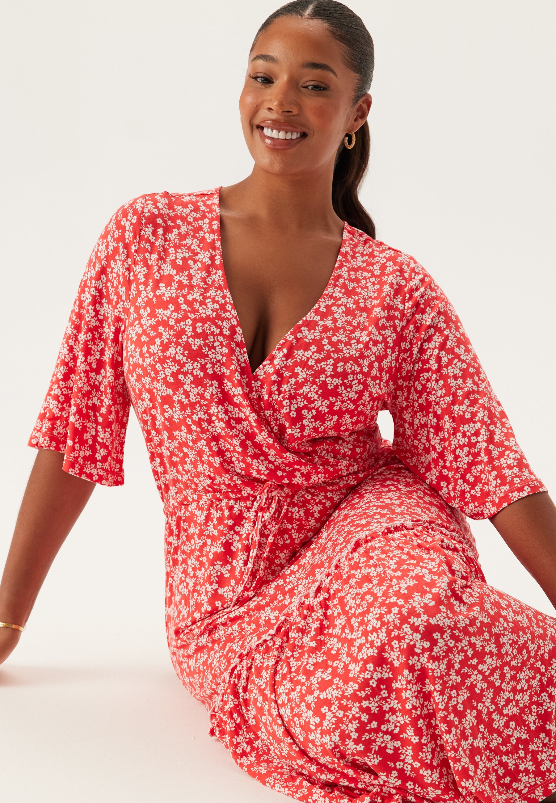 - Smickrande passform med ett knytband i midjan.